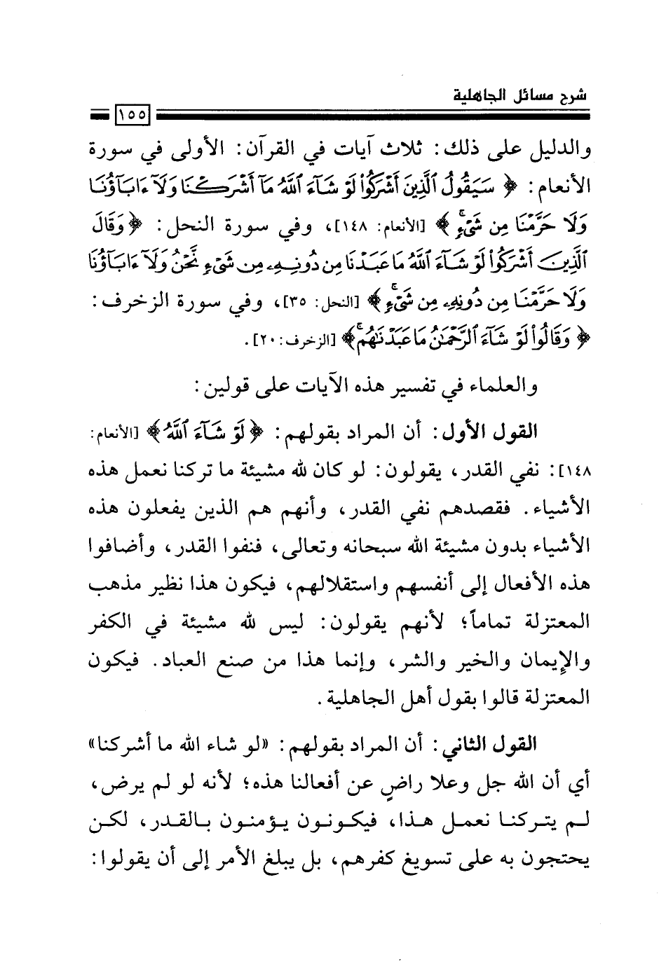 القول الأول: أن المراد بقولهم: {لَوْ شَاءَ اللَّهُ} [الأنعام: 148] : نفي القدر، يقولون: لو كان لله مشيئة ما تركنا نعمل هذه الأشياء. فقصدهم نفي القدر، وأنهم هم الذين يفعلون هذه الأشياء بدون مشيئة الله سبحانه وتعالى، فنفوا القدر، وأضافوا هذه الأفعال إلى أنفسهم واستقلالهم، فيكون هذا نظير مذهب المعتزلة تماماً؛ لأنهم يقولون: ليس لله مشيئة في الكفر والإيمان والخير والشر، وإنما هذا من صنع العباد. فيكون المعتزلة قالوا بقول أهل الجاهلية.