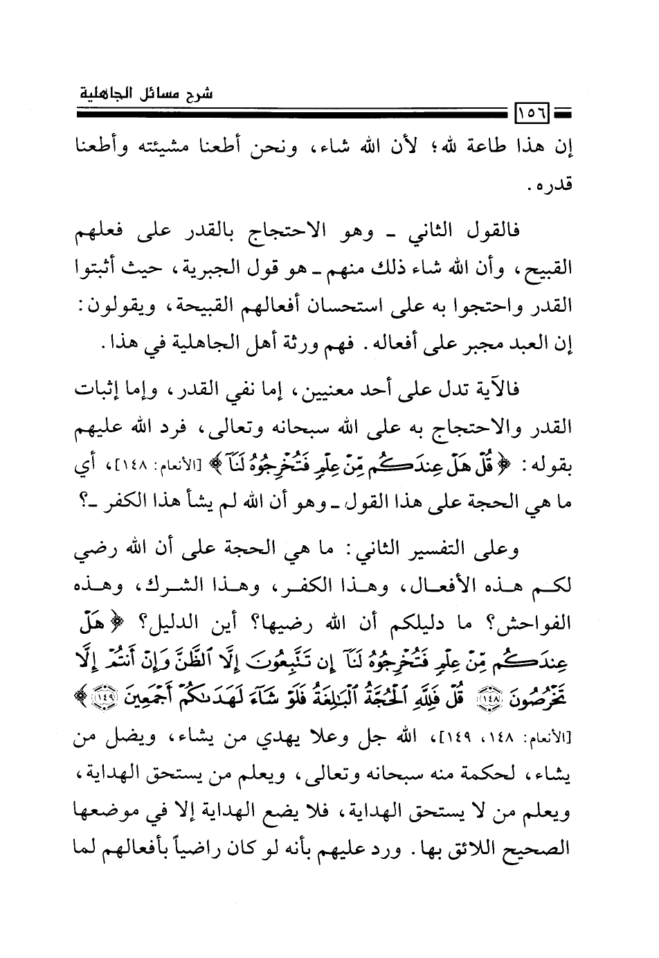 فالقول الثاني – وهو الاحتجاج بالقدر على فعلهم القبيح، وأن الله شاء ذلك منهم – هو قول الجبرية، حيث أثبتوا القدر واحتجوا به على استحسان أفعالهم القبيحة، ويقولون: إن العبد مجبر على أفعاله. فهم ورثة أهل الجاهلية في هذا.