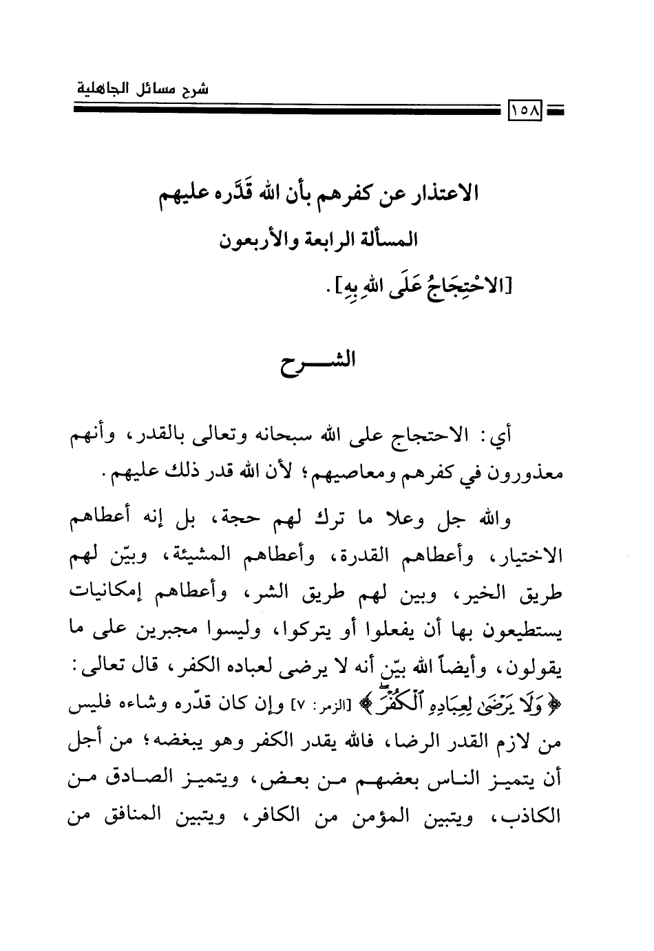 المسالة الرابعة والأربعون: الاعتذار عن كفرهم بأن الله تعالى قدره عليهم
