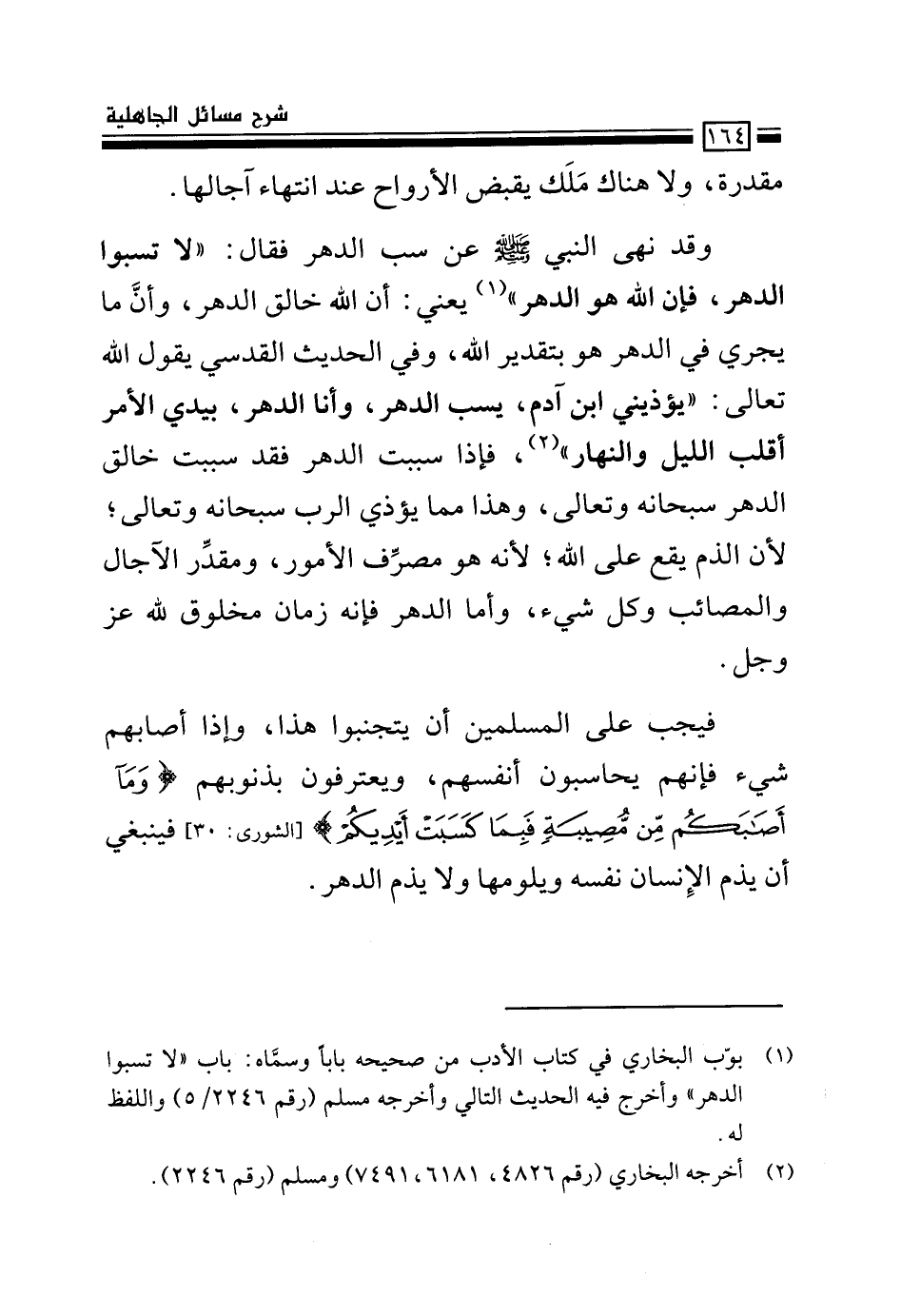 وقد نهى النبي صلى الله عليه وسلم عن سب الدهر فقال: "لا تسبوا الدهر، فإن الله هو الدهر" 1 يعني: أن الله خالق الدهر، وأنَّ ما يجري في الدهر هو بتقدير الله، وفي الحديث القدسي يقول الله تعالى: "يؤذيني ابن آدم، يسب الدهر، وأنا الدهر، بيدي الأمر أقلب الليل والنهار" 2، فإذا سببت الدهر فقد سببت خالق الدهر سبحانه وتعالى، وهذا مما يؤذي الرب سبحانه وتعالى؛ لأن الذم يقع على الله؛ لأنه هو مصرِّف الأمور، ومقدِّر الآجال والمصائب وكل شيء، وأما الدهر فإنه زمان مخلوق لله عز وجل.