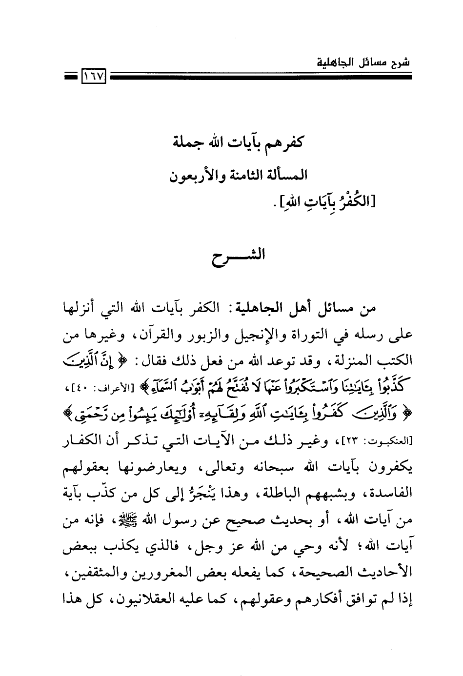 من مسائل أهل الجاهلية: الكفر بآيات الله التي أنزلها على رسله في التوراة والإنجيل والزبور والقرآن، وغيرها من الكتب المنزلة، وقد توعد الله من فعل ذلك فقال: {إِنَّ الَّذِينَ كَذَّبُوا بِآياتِنَا وَاسْتَكْبَرُوا عَنْهَا لا تُفَتَّحُ لَهُمْ أَبْوَابُ السَّمَاءِ} [الأعراف: 40] ، {وَالَّذِينَ كَفَرُوا بِآياتِ اللَّهِ وَلِقَائِهِ أُولَئِكَ يَئِسُوا مِنْ رَحْمَتِي} [العنكبوت: 23] ، وغير ذلك من الآيات التي تذكر أن الكفار يكفرون بآيات الله سبحانه وتعالى، ويعارضونها بعقولهم الفاسدة، وبشبههم الباطلة، وهذا عن رسول الله صلى الله عليه وسلم، فإنه من آيات الله؛ أو بحديث صحيح عن رسول الله صلى الله عليه وسلم، فإنه من آيات الله؛ لأنه وحي من الله عز وجل، فالذي يكذب ببعض الأحاديث الصحيحة، كما يفعله بعض المغرورين والمثقفين، إذا لم توافق أفكارهم وعقولهم، كما عليه العقلانيون، كل هذا