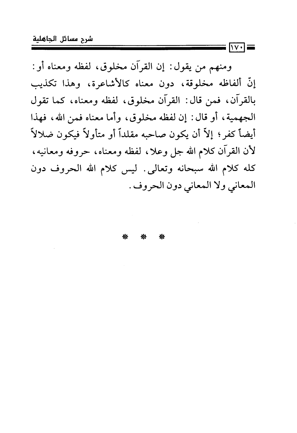 ومنهم من يقول: إن القرآن مخلوق، لفظه ومعناه أو: إنّ ألفاظه مخلوقة، دون معناه كالأشاعرة، وهذا تكذيب بالقرآن، فمن قال: القرآن مخلوق، لفظه ومعناه، كما تقول الجهمية، أو قال: إن لفظه مخلوق، وأما معناه فمن الله، فهذا أيضاً كفر؛ إلاّ أن يكون صاحبه مقلداً أو متأولاً فيكون ضلالاً لأن القرآن كلام الله جل وعلا، لفظه ومعناه، حروفه ومعانيه، كله كلام الله سبحانه وتعالى. ليس كلام الله الحروف دون المعاني ولا المعاني دون الحروف.