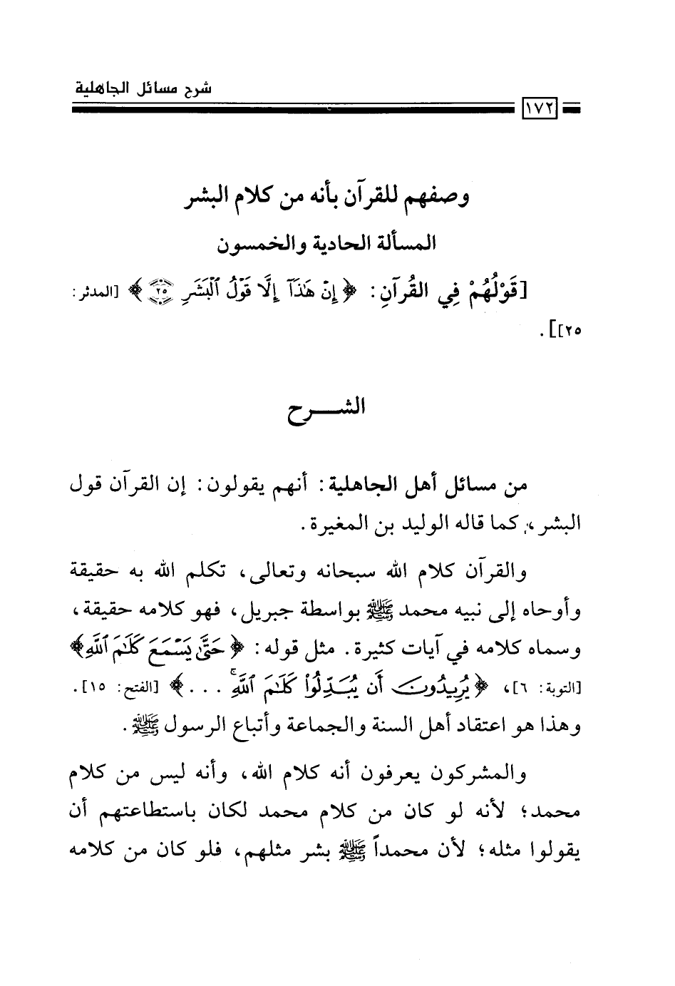 من مسائل أهل الجاهلية: أنهم يقولون: إن القرآن قول البشر، كما قاله الوليد بن المغيرة.