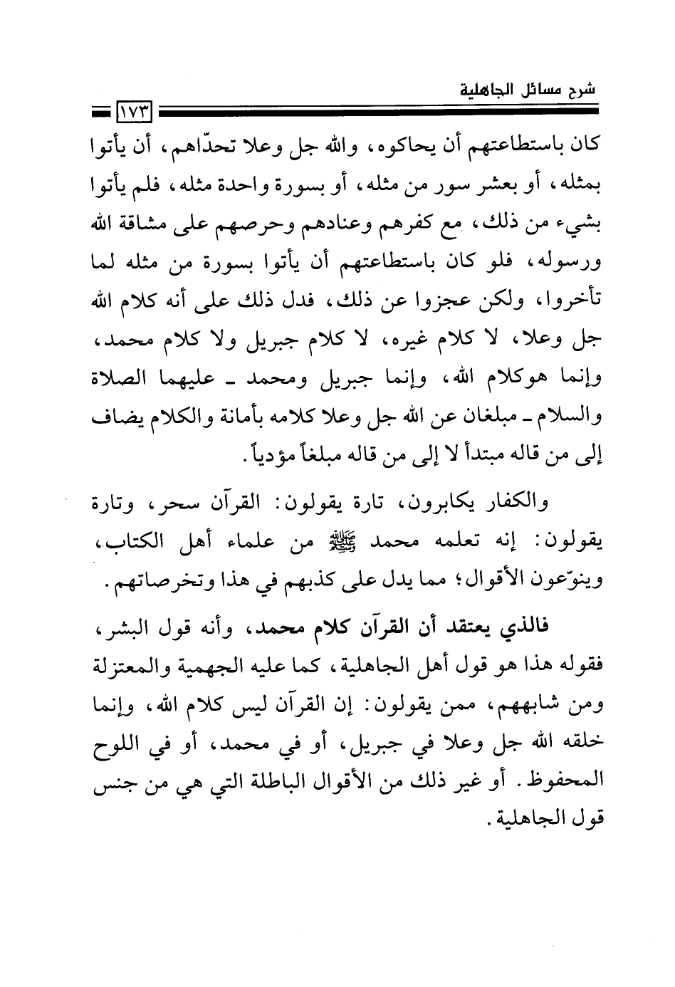 فالذي يعتقد أن القرآن كلام محمد، وأنه قول البشر، فقوله هذا هو قول أهل الجاهلية، كما عليه الجهمية والمعتزلة ومن شابههم، ممن يقولون: إن القرآن ليس كلام الله، وإنما خلقه الله جل وعلا في جبريل، أو في اللوح المحفوظ. أو غير ذلك من الأقوال الباطلة التي هي من جنس قول الجاهلية.