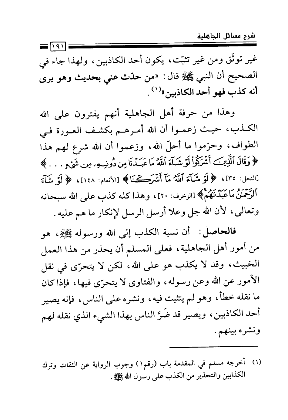 فالحاصل: أن نسبة الكذب إلى الله ورسوله صلى الله عليه وسلم، هو من أمور أهل الجاهلية، فعلى المسلم أن يحذر من هذا العمل الخبيث، وقد لا يكذب هو على الله، لكن لا يتحرّى في نقل الأمور عن الله وعن رسوله، والفتاوى لا يتحرّى فيها، فإذا كان ما نقله خطأ، وهو لم يتثبت فيه، ونشره على الناس، فإنه يصير أحد الكاذبين، ويصير قد ضَرَّ الناس بهذا الشيء الذي نقله لهم ونشره بينهم.