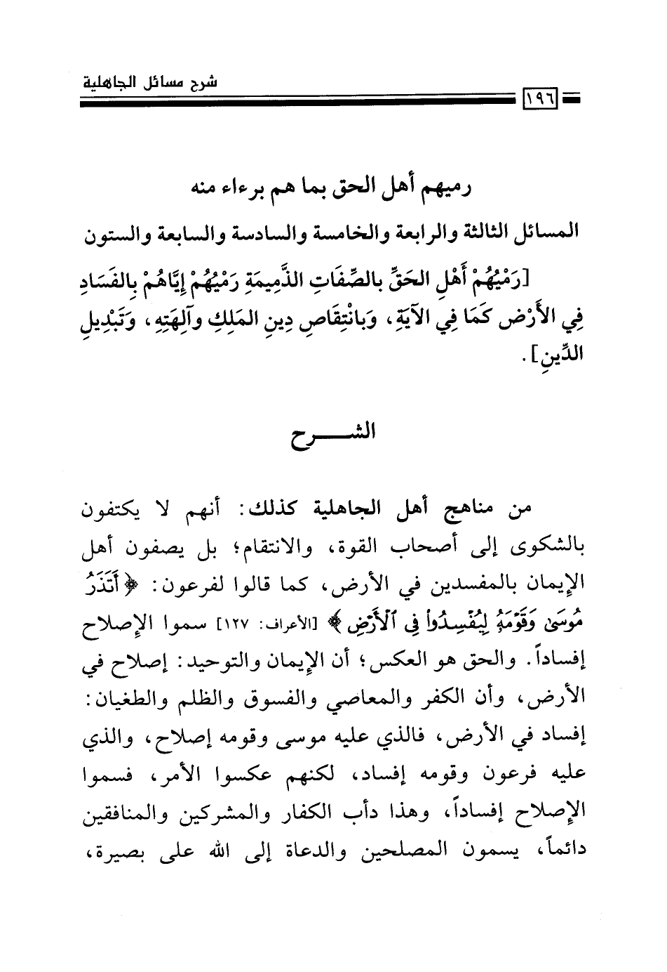 من مناهج أهل الجاهلية كذلك: أنهم لا يكتفون بالشكوى إلى أصحاب القوة، والانتقام؛ بل يصفون أهل الإيمان بالمفسدين في الأرض، كما قالوا لفرعون: {أَتَذَرُ مُوسَى وَقَوْمَهُ لِيُفْسِدُوا فِي الْأَرْضِ} [الأعراف: 127] سموا الإصلاح إفساداً. والحق هو العكس؛ أن الإيمان والتوحيد: إصلاح في الأرض، وأن الكفر والمعاصي والفسوق والظلم والطغيان: إفساد في الأرض، فالذي عليه موسى وقومه إصلاح، والذي عليه فرعون وقومه إفساد، لكنهم عكسوا الأمر، فسموا الإصلاح إفساداً، وهذا دأب الكفار والمشركين والمنافقين دائماً، يسمون المصلحين والدعاة إلى الله على بصيرة،