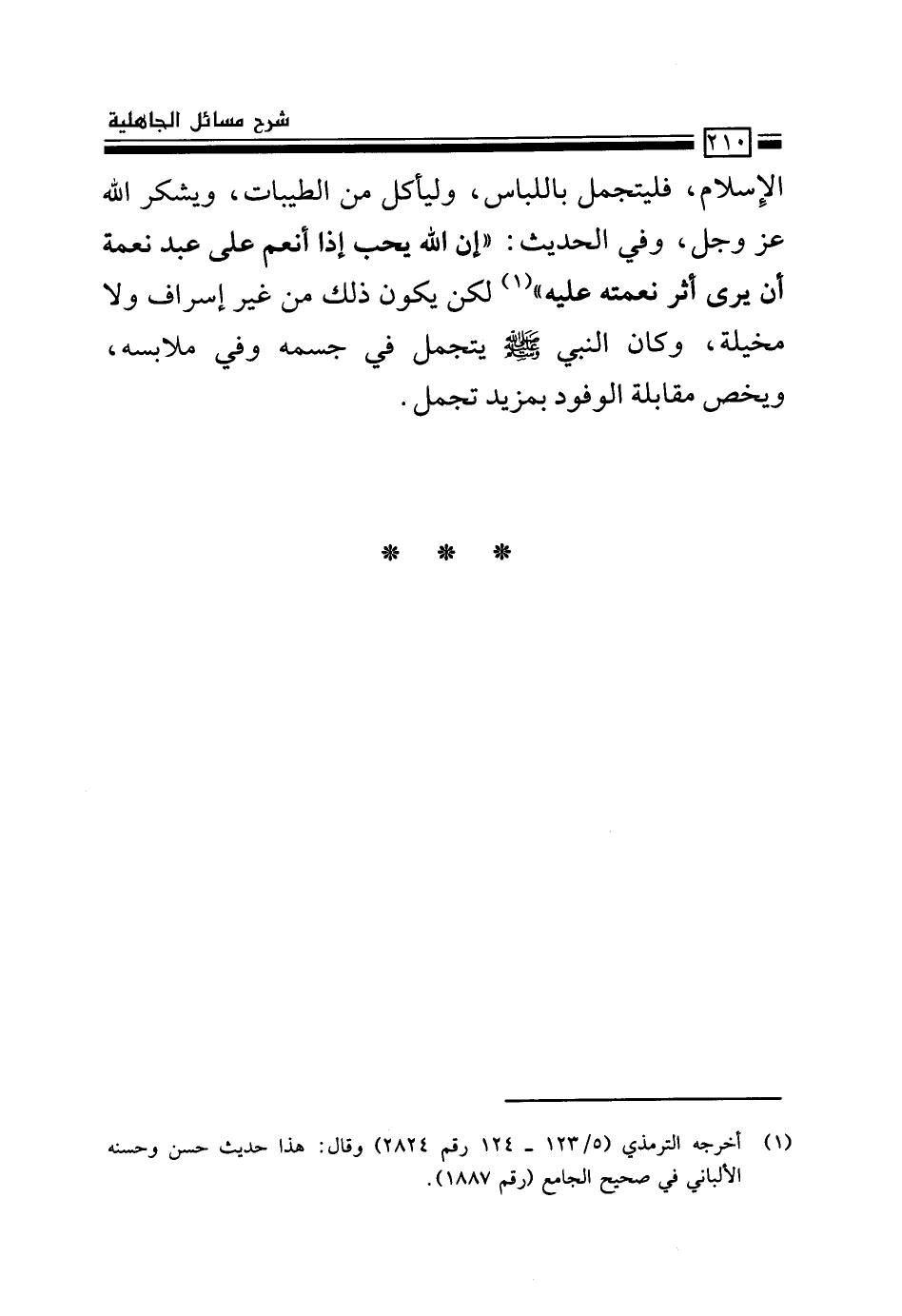 الإسلام، فليتجمل باللباس، وليأكل من الطيبات، ويشكر الله عز وجل، وفي الحديث: "إن الله يحب إذا أنعم عبد نعمة أن يرى أثر نعمته عليه" 1لكن يكون ذلك من غير إسراف ولا مخيلة، وكان النبي صلى الله عليه وسلم يتجمل في جسمه وفي ملابسه، ويخص مقابلة الوفود بمزيد تجمل.