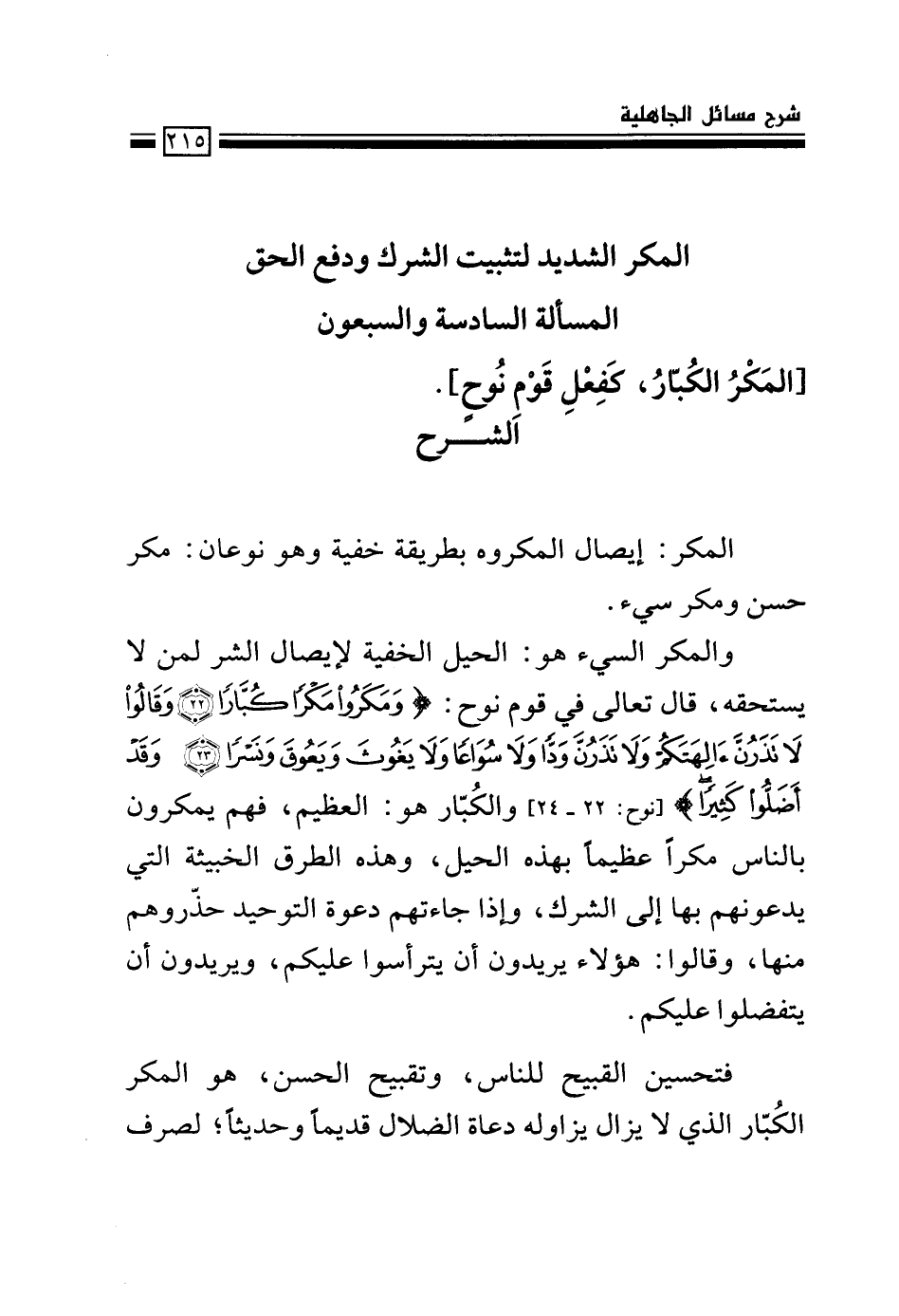 والمكر السيئ هو: الحيل الخفية لإيصال الشر لمن لا يستحقه، قال تعالى في قوم نوح: {وَمَكَرُوا مَكْراً كُبَّاراً وَقَالُوا لا تَذَرُنَّ آلِهَتَكُمْ وَلا تَذَرُنَّ وَدّاً وَلا سُوَاعاً وَلا يَغُوثَ وَيَعُوقَ وَنَسْراً وَقَدْ أَضَلُّوا كَثِيراً} [نوح: 22-24] والكبّار هو: العظيم، فهم يمكرون بالناس مكراً عظيماً بهذه الحيل، وهذه الطرق الخبيثة التي يدعونهم بها إلى الشرك، وإذا جاءتهم دعوة التوحيد حذّروهم منها، وقالوا: هؤلاء يريدون أن يترأسوا عليكم، ويريدون أن يتفضلوا عليكم.