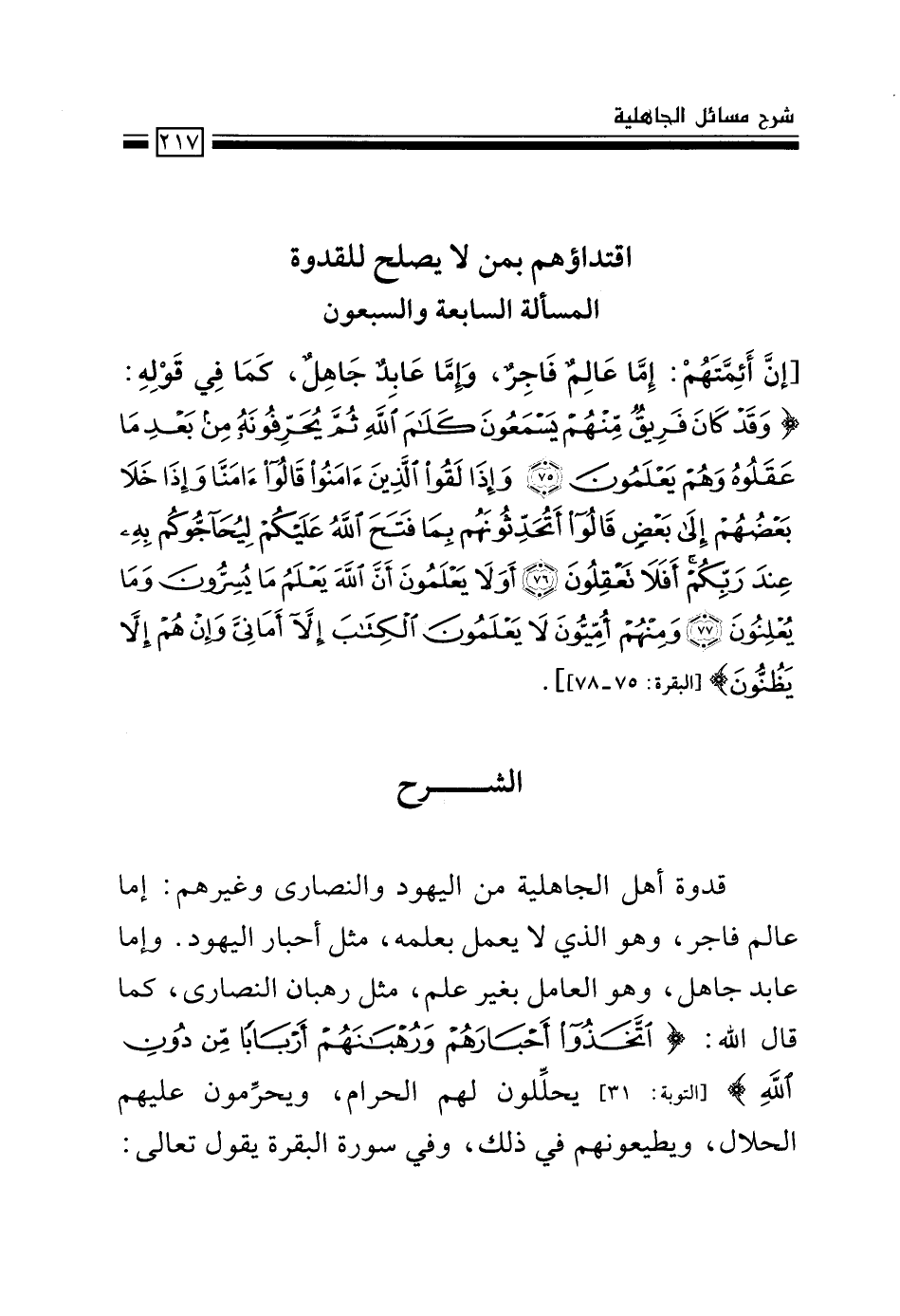 قدوة أهل الجاهلية من اليهود والنصارى وغيرهم: إما عالم فاجر، وهو الذي لا يعمل بعلمه، مثل أحبار اليهود. وإما عابد جاهل، وهو العامل بغير علم، مثل رهبان النصارى، كما قال الله: {اتَّخَذُوا أَحْبَارَهُمْ وَرُهْبَانَهُمْ أَرْبَاباً مِنْ دُونِ اللَّهِ} [التوبة: 31] يحلِّلون لهم الحرام، ويحرِّمون عليهم الحلال، ويطيعونهم في ذلك، وفي سورة البقرة يقول تعالى: