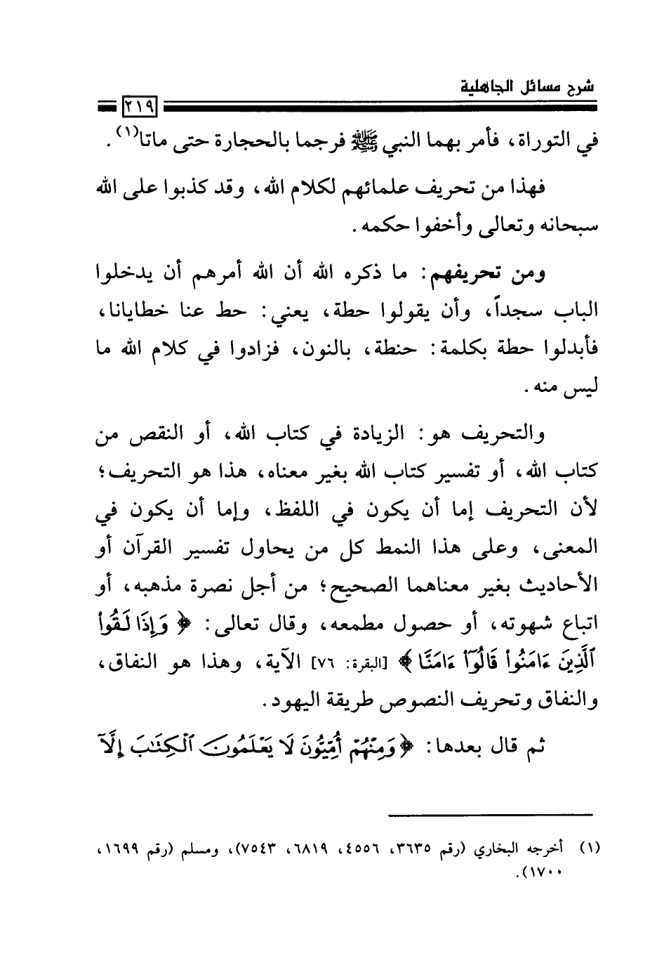 والتحريف هو: الزيادة في كتاب الله، أو النقص من كتاب الله، أو تفسير كتاب الله بغير معناه، هذا هو التحريف؛ لأن التحريف إما أن يكون في اللفظ، وإما أن يكون في المعنى، وعلى هذا النمط كل من يحاول تفسير القرآن أو الأحاديث بغير معناهما الصحيح؛ من أجل نصرة مذهبه، أو اتباع شهوته، أو حصول مطعمه، وقال تعالى: {وَإِذَا لَقُوا الَّذِينَ آمَنُوا قَالُوا آمَنَّا} [البقرة: 76] الآية، وهذا هو النفاق، والنفاق وتحريف النصوص طريقة اليهود.