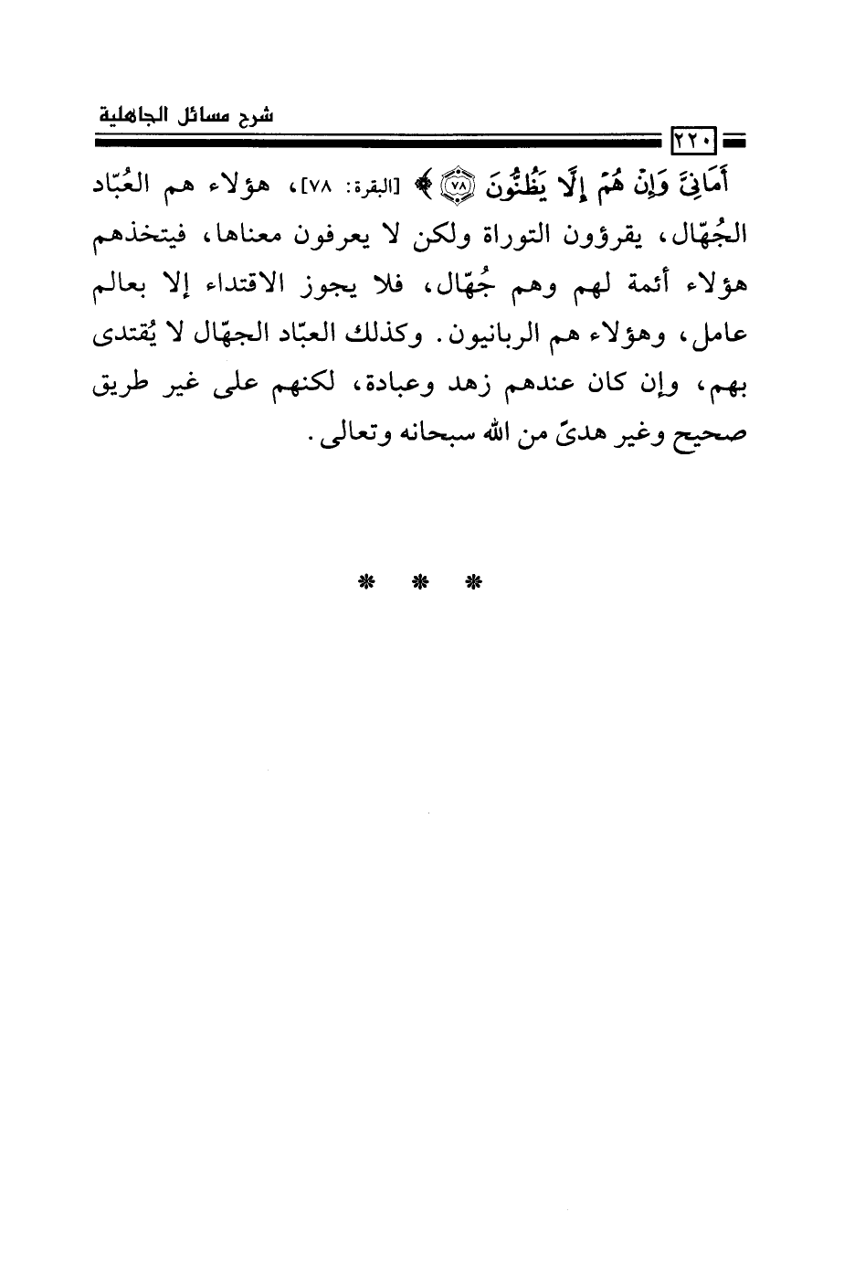 أَمَانِيَّ وَإِنْ هُمْ إِلَّا يَظُنُّونَ} [البقرة: 78] ، هؤلاء هم العُبَّاد الجُهّال، يقرؤون التوراة ولكن لا يعرفون معناها، فيتخذهم هؤلاء، يقرؤون التوراة ولكن لا يعرفون معناها، فيتخذهم هؤلاء أئمة لهم وهم جُهّال، فلا يجوز الاقتداء إلا بعالم عامل، وهؤلاء هم الربانيون. وكذلك العبّاد الجهّال لا يُقتدى بهم، وإن كان عندهم زهد وعبادة، لكنهم على غير طريق صحيح وغير هدىً من الله سبحانه وتعالى.