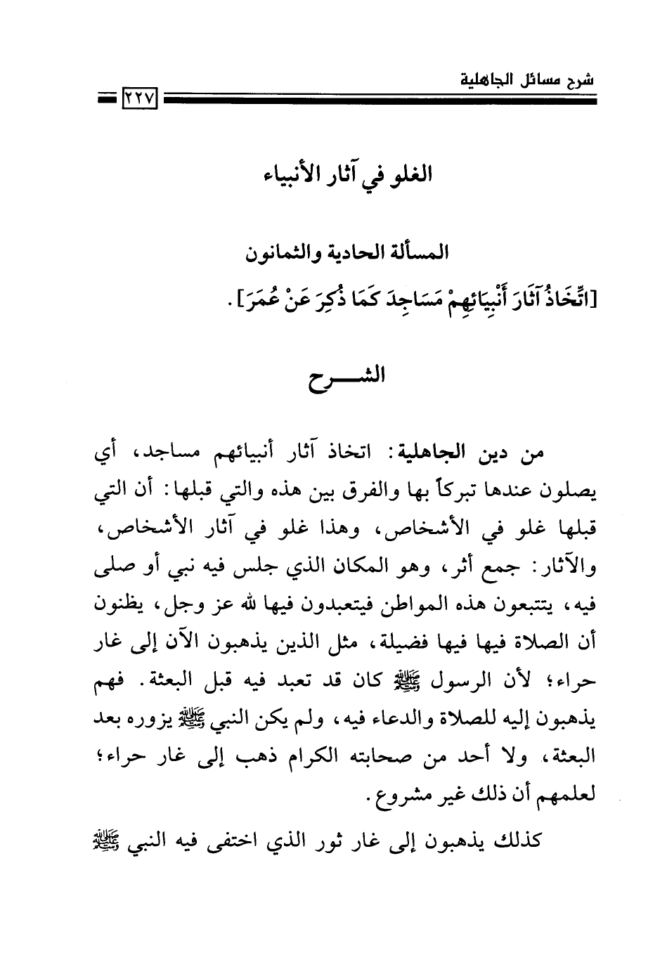 من دين الجاهلية: اتخاذ آثار أنبيائهم مساجد، أي يصلون عندها تبركاً بها والفرق بين هذه والتي قبلها: أن التي قبلها غلو في الأشخاص، وهذا غلو في آثار الأشخاص، والآثار: جمع أثر، وهو المكان الذي جلس فيه نبي أو صلى فيه، يتتبعون هذه المواطن فيتعبدون فيها لله عز وجل، يظنون أن الصلاة فيها فيها فضيلة، مثل الذين يذهبون الآن إلى غار حراء؛ لأن الرسول صلى الله عليه وسلم كان قد تعبد فيه قبل البعثة. فهم يذهبون إليه للصلاة والدعاء فيه، ولم يكن النبي صلى الله عليه وسلم يزوره بعد البعثة، ولا أحد من صحابته الكرام ذهب إلى غار حراء؛ لعلمهم أن ذلك غير مشروع.