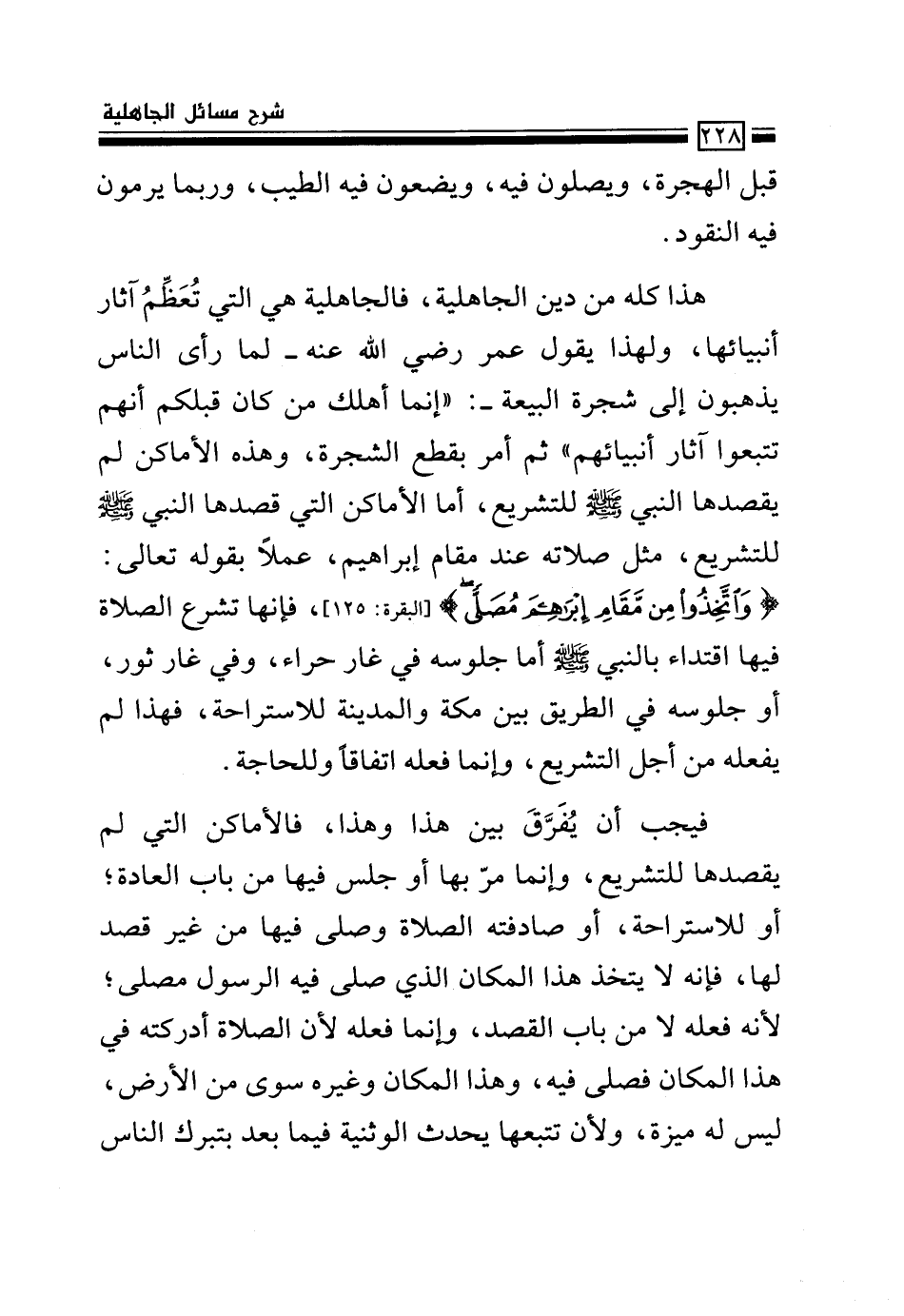 هذا كله من دين الجاهلية، فالجاهلية هي التي تُعَظِّم آثار أنبيائها، ولهذا يقول عمر رضي الله عنه – لما رأى الناس يذهبون إلى شجرة البيعة -: "إنما أهلك من كان قبلكم أنهم تتبعوا آثار أنبيائهم" ثم أمر بقطع الشجرة، وهذه الأماكن لم يقصدها النبي صلى الله عليه وسلم للتشريع، أما الأماكن التي قصدها النبي صلى الله عليه وسلم للتشريع، مثل صلاته عند مقام إبراهيم، عملاً بقوله تعالى: {وَاتَّخِذُوا مِنْ مَقَامِ إِبْرَاهِيمَ مُصَلّىً} [البقرة: 125] ، فإنها تشرع الصلاة فيها اقتداء بالنبي صلى الله عليه وسلم أما جلوسه في غار حراء، وفي غار ثور، أو جلوسه في الطريق بين مكة والمدينة للاستراحة، فهذا لم يفعله من أجل التشريع، وإنما فعله اتفاقاً وللحاجة.