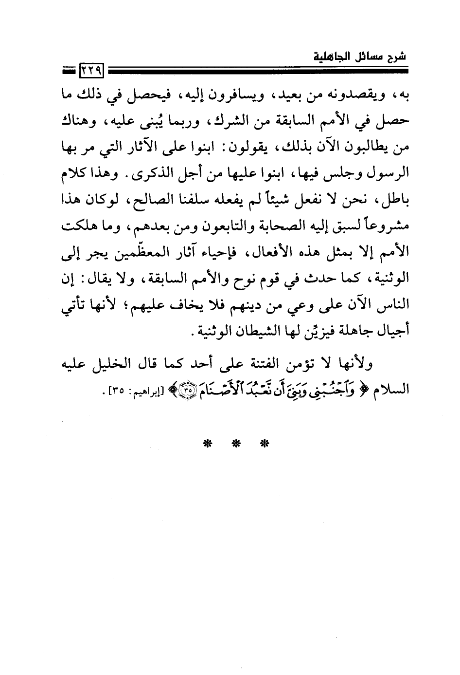 به، ويقصدونه من بعيد، ويسافرون إليه، فيحصل في ذلك ما حصل في الأمم السابقة من الشرك، وربما يُبنى عليه، وهناك من يطالبون الآن بذلك، يقولون: ابنوا على الآثار التي مر بها الرسول وجلس فيها، ابنوا عليها من أجل الذكرى. وهذا كلام باطل، نحن لا نفعل شيئاً لم يفعله سلفنا الصالح، لو كان هذا مشروعاً لسبق إليه الصحابة والتابعون ومن بعدهم، وما هلكت الأمم إلا بمثل هذه الأفعال، فإحياء آثار المعظّمين يجر إلى الوثنية، كما حدث في قوم نوح والأمم السابقة، ولا يقال: إن الناس الآن على وعي من دينهم فلا يخاف عليهم؛ لأنها تأتي أجيال جاهلية فيزيّن لها الشيطان الوثنية.