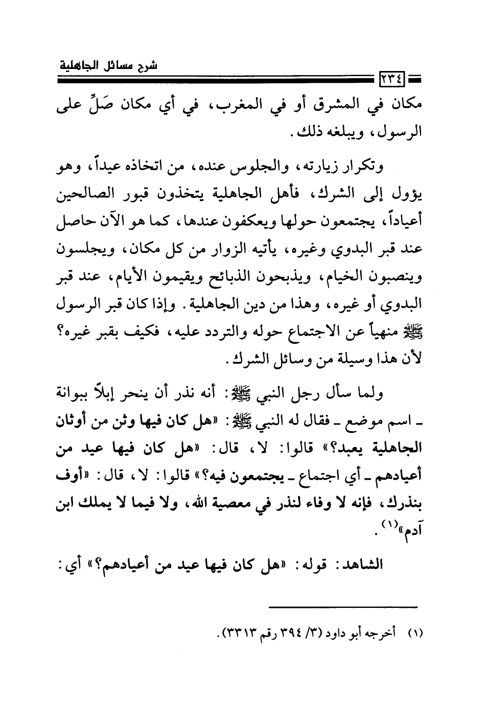 وتكرار زيارته، والجلوس عنده، من اتخاذه عيداً، وهو يؤول إلى الشرك، فأهل الجاهلية يتخذون قبور الصالحين أعياداً، يجتمعون حولها ويعكفون عندها، كما هو الآن حاصل عند قبر البدوي وغيره، يأتيه الزوار من كل مكان، ويجلسون وينصبون الخيام، ويذبحون الذبائح ويقيمون الأيام، عند قبر البدوي أو غيره، وهذا من دين الجاهلية. وإذا كان قبر الرسول صلى الله عليه وسلم منهياً عن الاجتماع حوله والتردد عليه، فكيف بقبر غيره؟ لأن هذا وسيلة من وسائل الشرك.