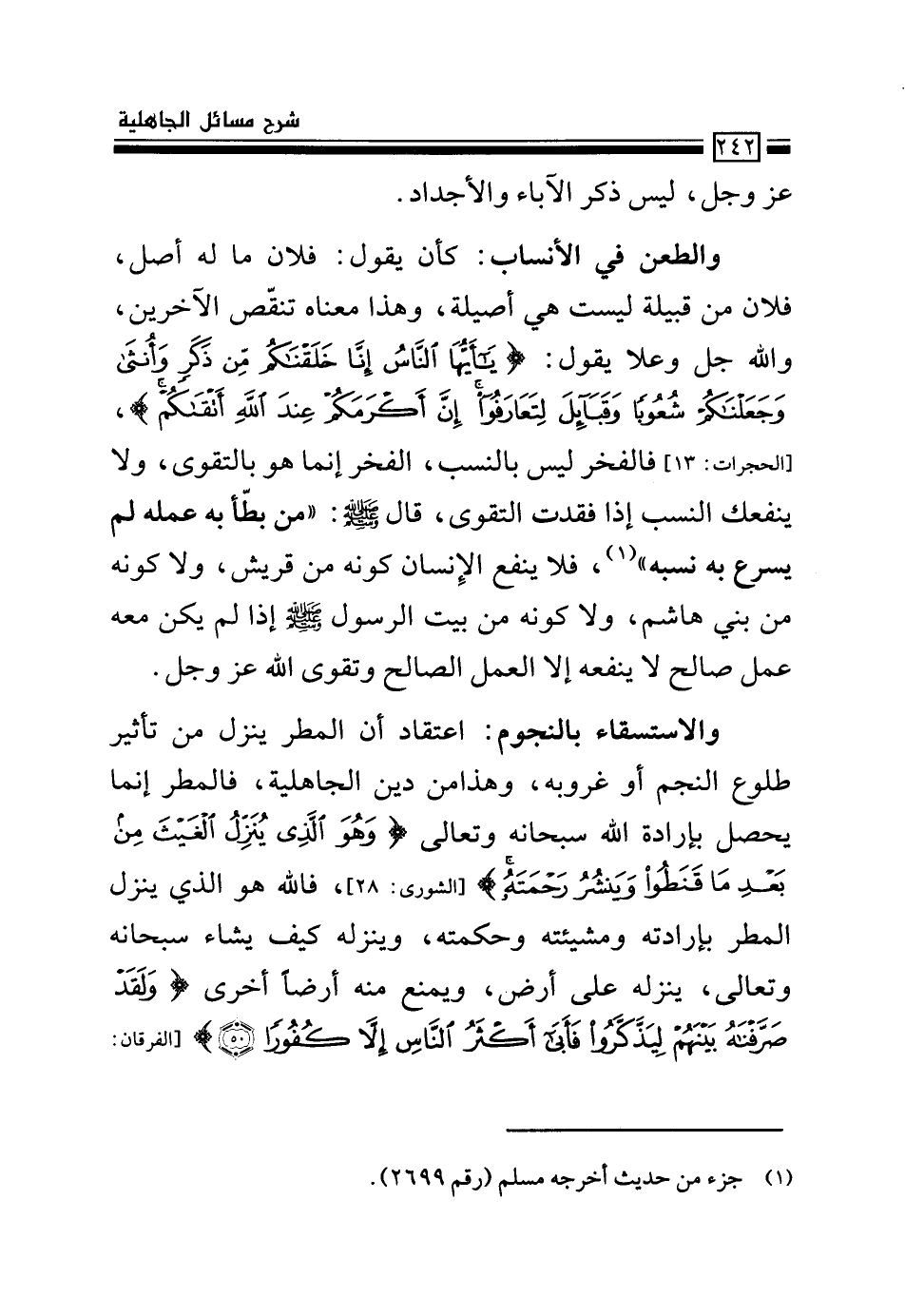 والطعن في الأنساب: كأن يقول: فلان ما له أصل، فلان من قبيلة ليست هي أصيلة، وهذا معناه تنقّص الآخرين، والله جل وعلا يقول: {يَا أَيُّهَا النَّاسُ إِنَّا خَلَقْنَاكُمْ مِنْ ذَكَرٍ وَأُنْثَى وَجَعَلْنَاكُمْ شُعُوباً وَقَبَائِلَ لِتَعَارَفُوا إِنَّ أَكْرَمَكُمْ عِنْدَ اللَّهِ أَتْقَاكُمْ} [الحجرات: 13] فالفخر ليس بالنسب، الفخر إنما هو بالتقوى، ولا ينفعك النسب إذا فقدت التقوى، قال صلى الله عليه وسلم: "من بطّأ به عمله لم يسرع به نسبه" 1، فلا ينفع الإنسان كونه من قريش، ولا كونه من بني هاشم، ولا كونه من بيت الرسول صلى الله عليه وسلم إذا لم يكن معه عمل صالح لا ينفعه إلا العمل الصالح وتقوى الله عز وجل.