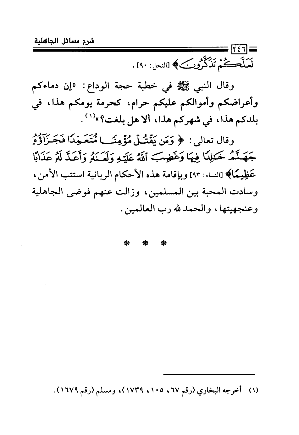 وقال تعالى: {وَمَنْ يَقْتُلْ مُؤْمِناً مُتَعَمِّداً فَجَزَاؤُهُ جَهَنَّمُ خَالِداً فِيهَا وَغَضِبَ اللَّهُ عَلَيْهِ وَلَعَنَهُ وَأَعَدَّ لَهُ عَذَاباً عَظِيماً} [النساء:93] وبإقامة هذه الأحكام الربانية استتب الأمن، وسادت المحبة بين المسلمين، وزالت عنهم فوضى الجاهلية وعنجهيتها، والحمد لله رب العالمين.