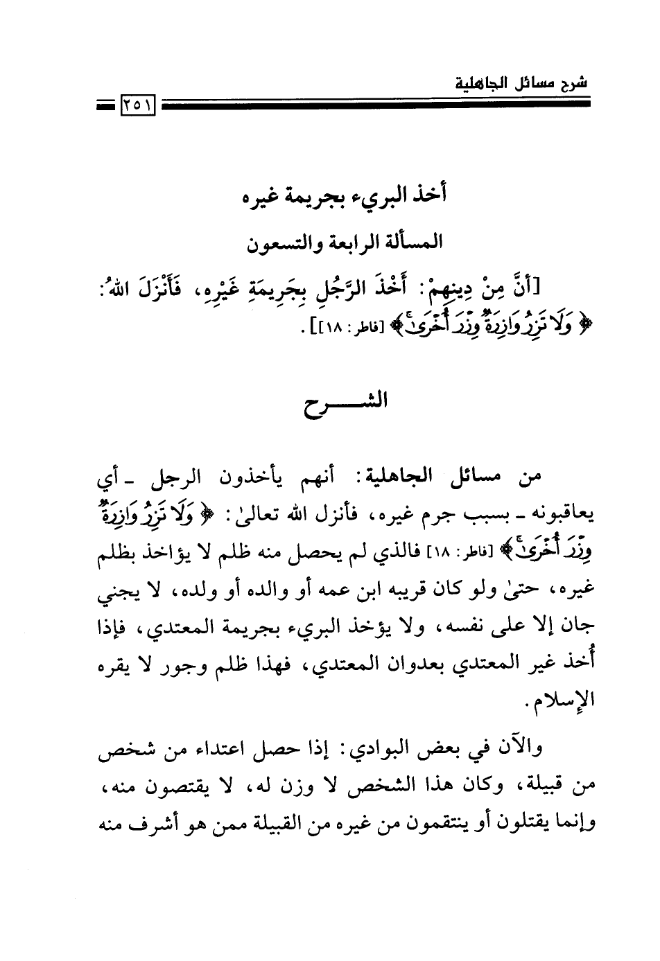 من مسائل الجاهلية: أنهم يأخذون الرجل –أي يعاقبونه- بسبب جرم غيره، فأنزل الله تعالى: {وَلا تَزِرُ وَازِرَةٌ وِزْرَ أُخْرَى} [فاطر: 18] فالذي لم يحصل منه ظلم لا يؤاخذ بظلم غيره، حتى لو كان قريبه ابن عمه أو والده أو ولده، لا يجني جان إلا على نفسه، ولا يؤخذ البريء بجريمة المعتدي، فإذا أُخذ غير المعتدي بعدوان المعتدي، فهذا ظلم وجور لا يقره الإسلام.