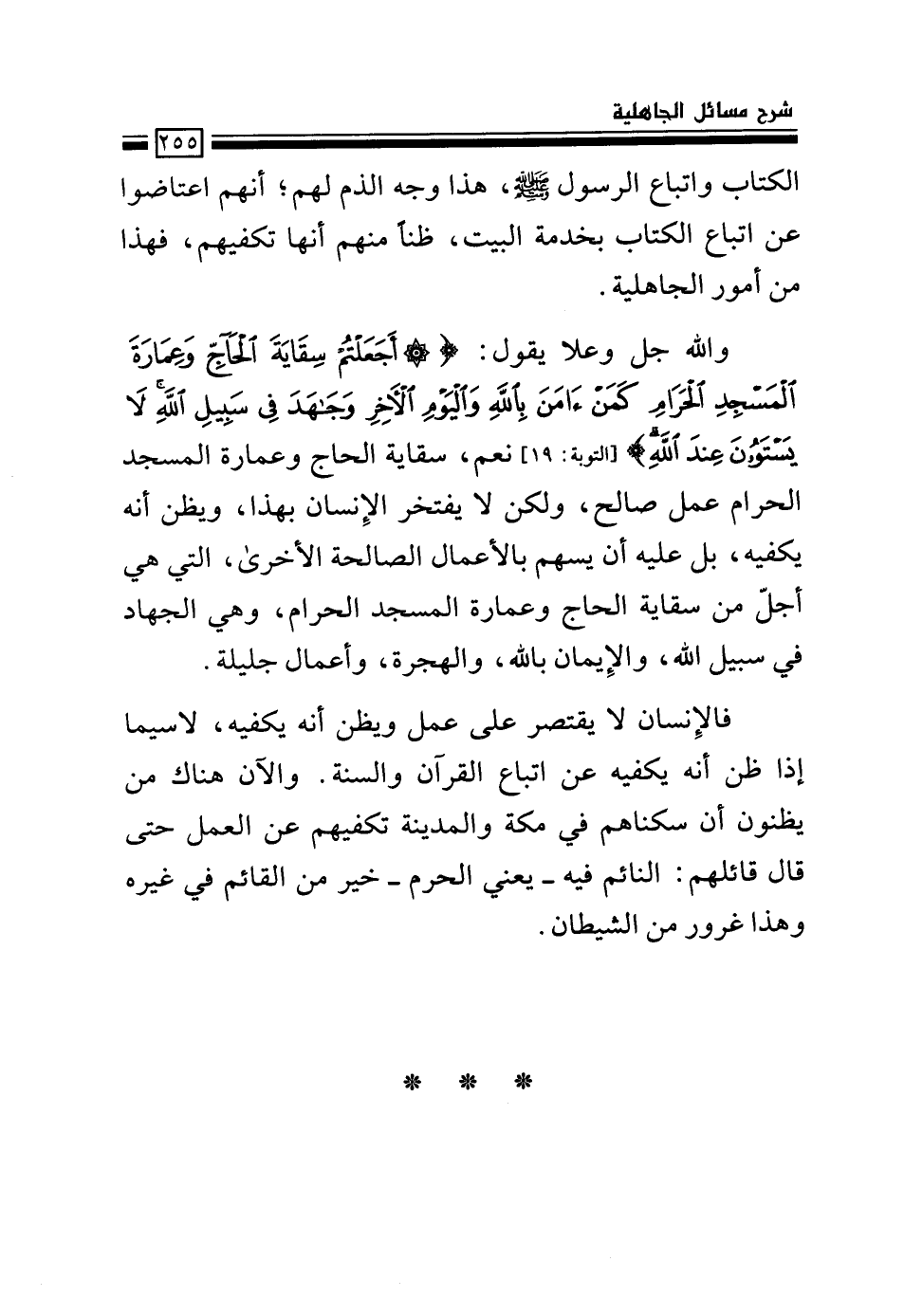 والله جل وعلا يقول: {أَجَعَلْتُمْ سِقَايَةَ الْحَاجِّ وَعِمَارَةَ الْمَسْجِدِ الْحَرَامِ كَمَنْ آمَنَ بِاللَّهِ وَالْيَوْمِ الْآخِرِ وَجَاهَدَ فِي سَبِيلِ اللَّهِ لا يَسْتَوُونَ عِنْدَ اللَّهِ} [التوبة: 19] نعم، سقاية الحاج وعمارة المسجد الحرام عمل صالح، ولكن لا يفتخر الإنسان بهذا، ويظن أنه يكفيه، بل عليه أن يسهم بالأعمال الصالحة الأخرى، التي هي أجلّ من سقاية الحاج وعمارة المسجد الحرام، وهي الجهاد في سبيل الله، والإيمان بالله، والهجرة، وأعمال جليلة.