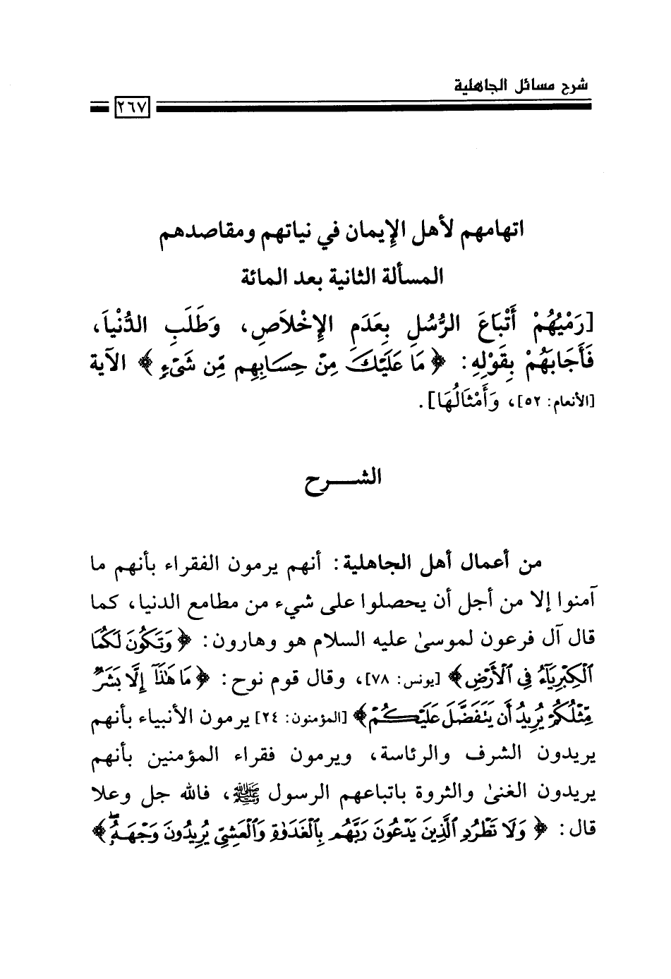 من أعمال أهل الجاهلية: أنهم يرمون الفقراء بأنهم ما آمنوا إلا من أجل ألان يحصلوا على شيء من مطامع الدنيا، كما قال آل فرعون لموسى عليه السلام هو وهارون: {مَا هَذَا إِلَّا بَشَرٌ مِثْلُكُمْ يُرِيدُ أَنْ يَتَفَضَّلَ عَلَيْكُمْ} [المؤمنون: 24] يرمون الأنبياء بأنهم يريدون الشرف والرئاسة، ويرمون فقراء المؤمنين بأنهم يريدون الغنى والثروة باتباعهم الرسول صلى الله عليه وسلم، فالله جل وعلا قال: {وَلا تَطْرُدِ الَّذِينَ يَدْعُونَ رَبَّهُمْ بِالْغَدَاةِ وَالْعَشِيِّ يُرِيدُونَ وَجْهَهُ}