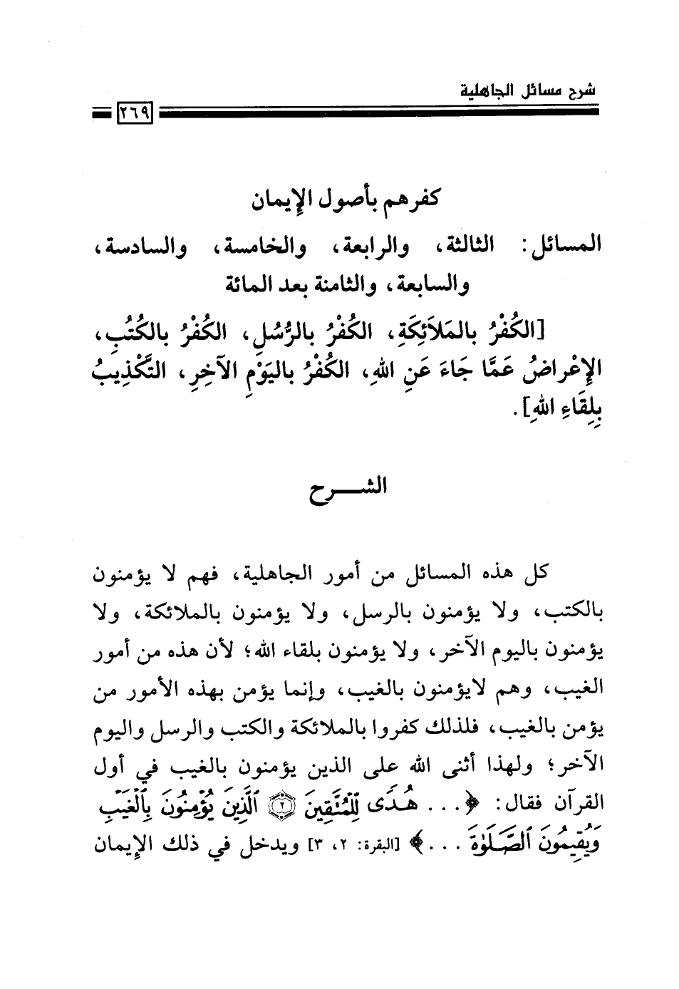 كل هذه المسائل من أمور الجاهلية، فهم لا يؤمنون بالكتب، ولا يؤمنون بالرسل، ولا يؤمنون بالملائكة، ولا يؤمنون باليوم الآخر، ولا يؤمنون بلقاء الله؛ لأن هذه من أمور الغيب، وهم لا يؤمنون بالغيب، وإنما يؤمن بهذه الأمور من يؤمن بالغيب، فلذلك كفروا بالملائكة والكتب والرسل واليوم الآخر؛ ولهذا أثنى الله على الذين يؤمنون بالغيب في أول القرآن فقال: { ... هُدىً لِلْمُتَّقِينَ الَّذِينَ يُؤْمِنُونَ بِالْغَيْبِ وَيُقِيمُونَ الصَّلاةَ ... } [البقرة: 2، 3] ويدخل في ذلك الإيمان