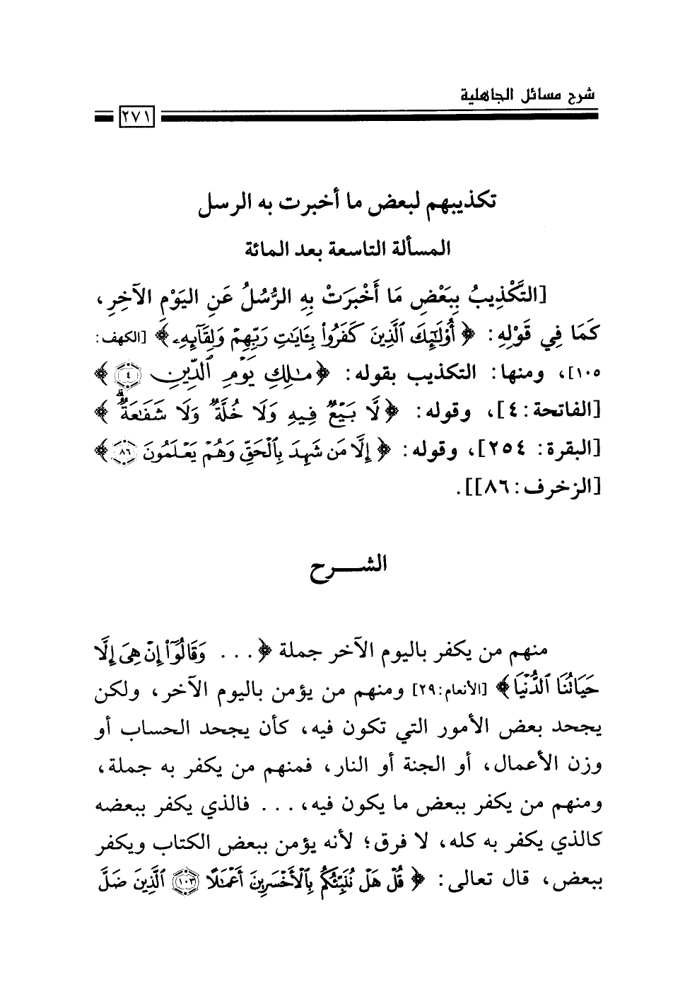 [التَّكْذِيبُ بِبَعْضِ مَا أَخْبَرتْ به الرُّسُلُ عن اليوم الآخر، كما في قوله: {أُولَئِكَ الَّذِينَ كَفَرُوا بِآياتِ رَبِّهِمْ وَلِقَائِهِ} [الكهف: 105] ، ومنها: التكذيب بقوله: {مَالِكِ يَوْمِ الدِّينِ} [الفاتحة: 4] ، وقوله: {لا بَيْعٌ فِيهِ وَلا خُلَّةٌ وَلا شَفَاعَةٌ} [البقرة: 254] ، وقوله: {إِلَّا مَنْ شَهِدَ بِالْحَقِّ وَهُمْ يَعْلَمُونَ} [الزخرف: 86] .