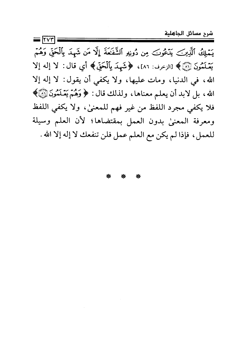 يَمْلِكُ الَّذِينَ يَدْعُونَ مِنْ دُونِهِ الشَّفَاعَةَ إِلَّا مَنْ شَهِدَ بِالْحَقِّ وَهُمْ يَعْلَمُونَ} [الزخرف: 86] ، {شَهِدَ بِالْحَقِّ} أي قال: لا إله إلا الله، في الدنيا، ومات عليها، ولا يكفي أن يقول: لا إله إلا الله، بل لا بد أن يعلم معناها، ولذلك قال: {وَهُمْ يَعْلَمُونَ} فلا يكفي مجرد اللفظ من غير فهم للمعنى، ولا يكفي اللفظ ومعرفة المعنى بدون العمل بمقتضاها؛ لأن العلم وسيلة للعمل، فإذا لم يكن مع العلم عمل فلن تنفعك لا إله إلا الله.