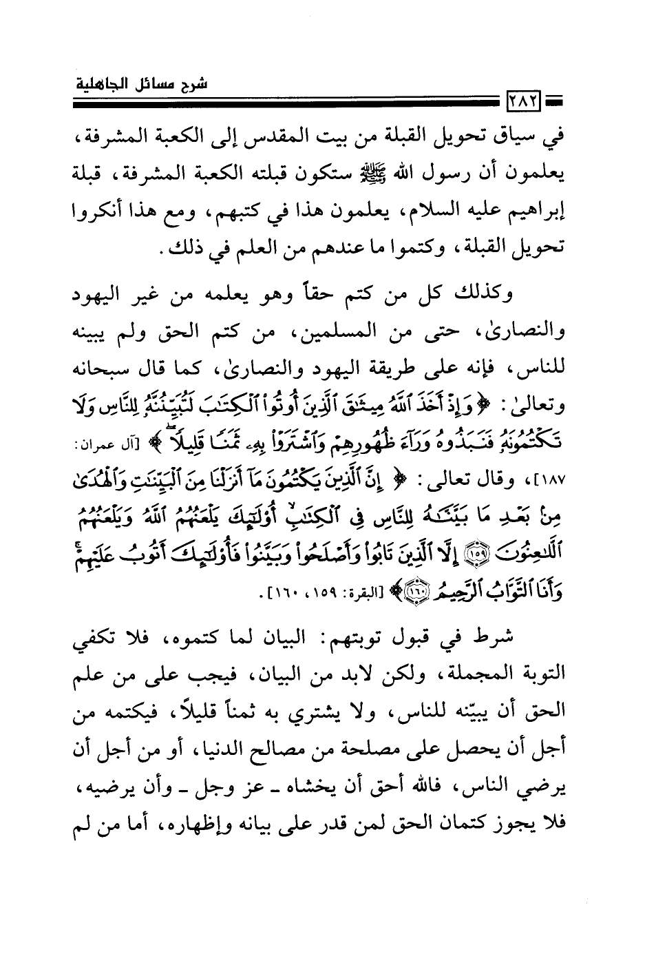وكذلك كل من كتم حقاً وهو يعلمه من غير اليهود والنصارى، حتى من المسلمين، من كتم الحق ولم يبينه للناس، فإنه على طريقة اليهود والنصارى، كما قال سبحانه وتعالى: {وَإِذْ أَخَذَ اللَّهُ مِيثَاقَ الَّذِينَ أُوتُوا الْكِتَابَ لَتُبَيِّنُنَّهُ لِلنَّاسِ وَلا تَكْتُمُونَهُ فَنَبَذُوهُ وَرَاءَ ظُهُورِهِمْ وَاشْتَرَوْا بِهِ ثَمَناً قَلِيلاً} [آل عمران: 187] ، وقال تعالى: {إِنَّ الَّذِينَ يَكْتُمُونَ مَا أَنْزَلْنَا مِنَ الْبَيِّنَاتِ وَالْهُدَى مِنْ بَعْدِ مَا بَيَّنَّاهُ لِلنَّاسِ فِي الْكِتَابِ أُولَئِكَ يَلْعَنُهُمُ اللَّهُ وَيَلْعَنُهُمُ اللَّاعِنُونَإِلَّا الَّذِينَ تَابُوا وَأَصْلَحُوا وَبَيَّنُوا فَأُولَئِكَ أَتُوبُ عَلَيْهِمْ وَأَنَا التَّوَّابُ الرَّحِيمُ} [البقرة: 159، 160] . شرط في قبول توبتهم: البيان لما كتموه، فلا تكفي التوبة المجملة، ولكن لا بد من البيان، فيجب على من علم الحق أن يبيّنه للناس، ولا يشتري به ثمناً قليلاً، فيكتمه من أجل أن يحصل على مصلحة من مصالح الدنيا، أو من أجل أن يرضي الناس، فالله أحق أن يخشاه –عز وجل –وأن يرضيه، فلا يجوز كتمان الحق لمن قدر على بيانه وإظهاره، أما من لم