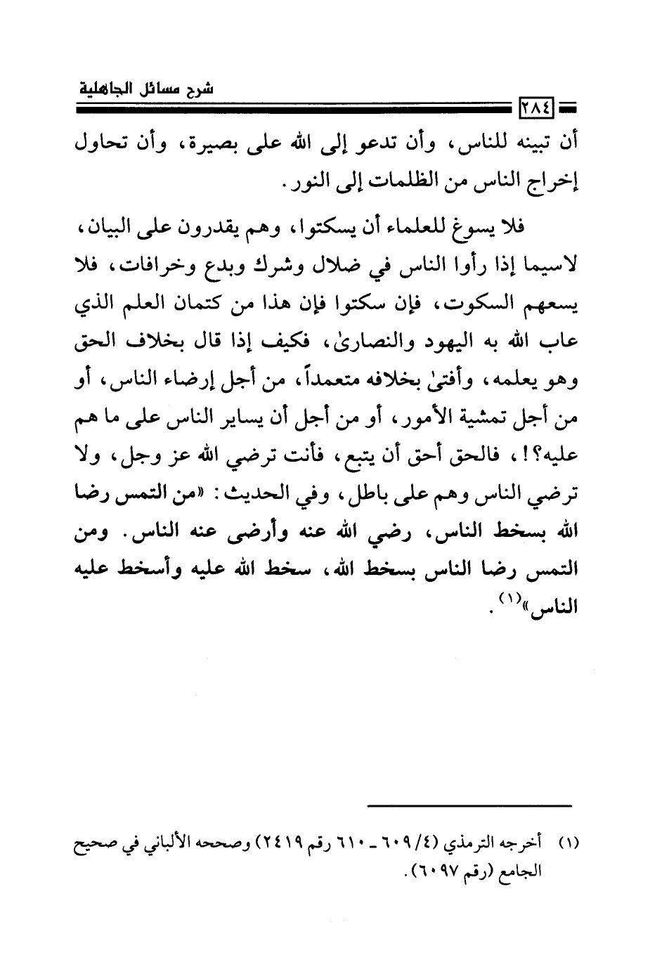 فلا يسوغ للعلماء أن يسكتوا، وهم يقدرون على البيان، لا سيما إذا رأوا الناس في ضلال وشرك وبدع وخرافات، فلا يسعهم السكوت، فإن سكتوا فإن هذا من كتمان العلم الذي عاب الله به اليهود والنصارى، فكيف إذا قال بخلاف الحق وهو يعلمه، وأفتى بخلافه معتمداً، من أجل إرضاء الناس، أو من أجل تمشية الأمور، أو من أجل أن يساير الناس على ما هم عليه؟!، فالحق أحق أن يتبع، فأنت ترضي الله عز وجل، ولا ترضي الناس وهم على باطل، وفي الحديث: "من التمس رضا الله بسخط الناس رضي الله عنه وأرضى عنه الناس، ومن التمس رضا الناس بسخط الله، سخط الله عليه وأسخط عليه الناس" 1.
