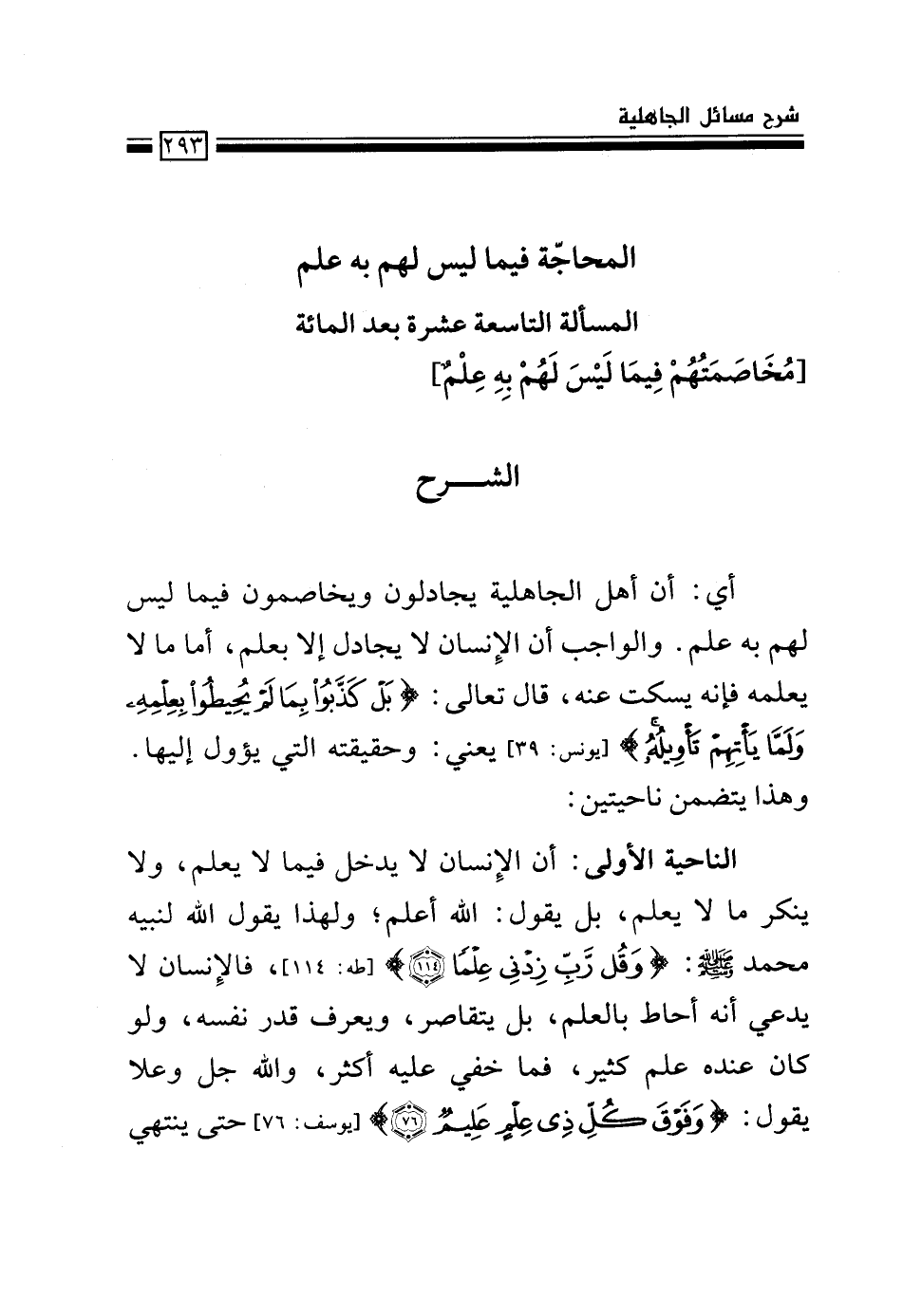 أي: أن أهل الجاهلية يجادلون ويخاصمون فيما ليس لهم به علم. والواجب أن الإنسان لا يجادل إلا بعلم، أما ما لا يعلمه فإنه يسكت عنه، قال تعالى: {بَلْ كَذَّبُوا بِمَا لَمْ يُحِيطُوا بِعِلْمِهِ وَلَمَّا يَأْتِهِمْ تَأْوِيلُهُ} [يونس: 39] يعني: وحقيقته التي يؤول إليها. وهذا يتضمن ناحيتين: