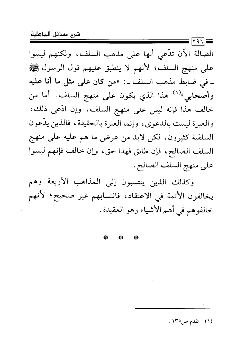 الضالة الآن تدّعي أنها على مذهب السلف، ولكنهم ليسوا على منهج السلف؛ لأنهم لا ينطبق عليهم قول الرسول صلى الله عليه وسلم – في ضابط مذهب السلف -: "من كان على مثل ما أنا عليه وأصحابي" 1 هذا الذي يكون على منهج السلف. أما من خالف هذا فإنه ليس على منهج السلف، وإن ادّعى ذلك، والعبرة ليست بالدعوى، وإنما العبرة بالحقيقة، فالذين يدّعون السلفية كثيرون، لكن لا بد من عرض ما هم عليه على منهج السلف الصالح، فإن طابق فهذا حق، وإن خالف فإنهم ليسوا على منهج السلف الصالح.
