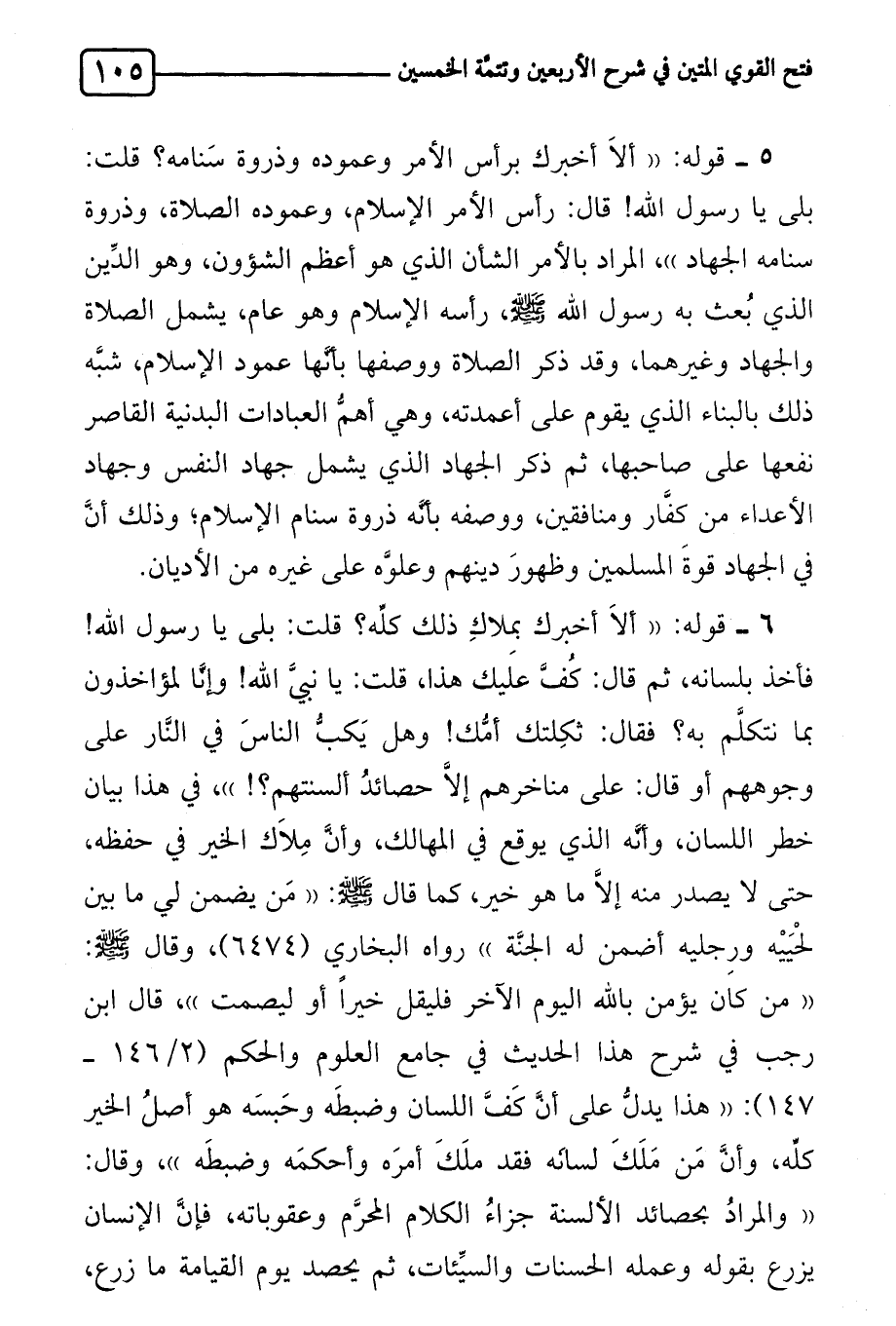 5 قوله: "ألاَ أخبرك برأس الأمر وعموده وذروة سَنامه؟ قلت: بلى يا رسول الله! قال: رأس الأمر الإسلام، وعموده الصلاة، وذروة سنامه الجهاد"، المراد بالأمر الشأن الذي هو أعظم الشؤون، وهو الدِّين الذي بُعث به رسول الله صلى الله عليه وسلم، رأسه الإسلام وهو عام، يشمل الصلاة والجهاد وغيرهما، وقد ذكر الصلاة ووصفها بأنَّها عمود الإسلام، شبَّه ذلك بالبناء الذي يقوم على أعمدته، وهي أهمُّ العبادات البدنية القاصر نفعها على صاحبها، ثم ذكر الجهاد الذي يشمل جهاد النفس وجهاد الأعداء من كفَّار ومنافقين، ووصفه بأنَّه ذروة سنام الإسلام؛ وذلك أنَّ في الجهاد قوةَ المسلمين وظهورَ دينهم وعلوَّه على غيره من الأديان.