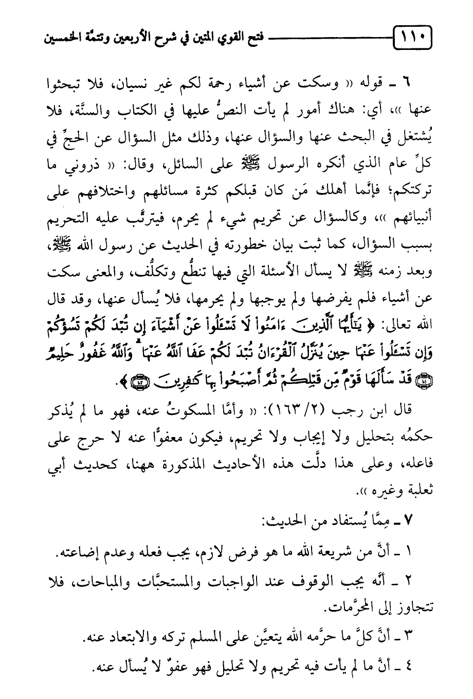 6 قوله "وسكت عن أشياء رحمة لكم غير نسيان، فلا تبحثوا عنها"، أي: هناك أمور لم يأت النصُّ عليها في الكتاب والسنَّة، فلا يُشتغل في البحث عنها والسؤال عنها، وذلك مثل السؤال عن الحجِّ في كلِّ عام الذي أنكره الرسول صلى الله عليه وسلم على السائل، وقال: "ذروني ما تركتكم؛ فإنَّما أهلك مَن كان قبلكم كثرة مسائلهم واختلافهم على أنبيائهم"، وكالسؤال عن تحريم شيء لم يحرم، فيترتَّب عليه التحريم بسبب السؤال، كما ثبت بيان خطورته في الحديث عن رسول الله صلى الله عليه وسلم، وبعد زمنه صلى الله عليه وسلم لا يسأل الأسئلة التي فيها تنطُّع وتكلُّف، والمعنى سكت عن أشياء فلم يفرضها ولم يوجبها ولم يحرمها، فلا يُسأل عنها، وقد قال الله تعالى: {يَا أَيُّهَا الَّذِينَ آمَنُوا لا تَسْأَلوا عَنْ أَشْيَاءَ إِنْ تُبْدَ لَكُمْ تَسُؤْكُمْ وَإِنْ تَسْأَلوا عَنْهَا حِينَ يُنَزَّلُ الْقُرْآنُ تُبْدَ لَكُمْ عَفَا اللَّهُ عَنْهَا وَاللَّهُ غَفُورٌ حَلِيمٌ قَدْ سَأَلَهَا قَوْمٌ مِنْ قَبْلِكُمْ ثُمَّ أَصْبَحُوا بِهَا كَافِرِينَ}