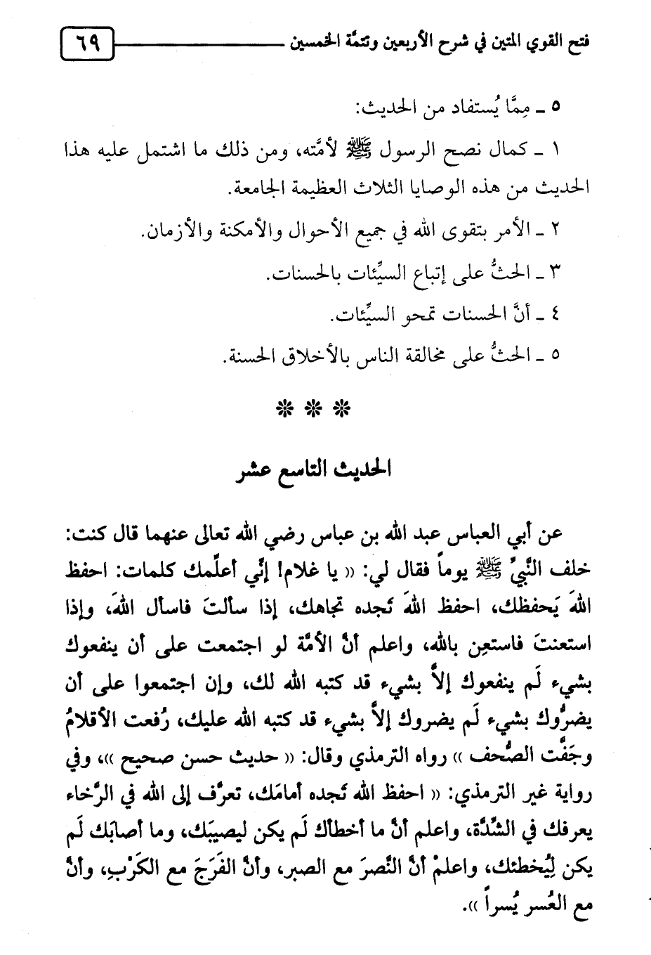 عن أبي العباس عبد الله بن عباس رضي الله تعالى عنهما قال كنت: خلف النَّبيِّ صلى الله عليه وسلم يوماً فقال لي: "يا غلام! إنِّي أعلِّمك كلمات: احفظ اللهَ يَحفظك، احفظ اللهَ تَجده تجاهك، إذا سألتَ فاسأل اللهَ، وإذا استعنتَ فاستعِن بالله، واعلم أنَّ الأمَّة لو اجتمعت على أن ينفعوك بشيء لَم ينفعوك إلاَّ بشيء قد كتبه الله لك، وإن اجتمعوا على أن يضرُّوك بشيء لَم يضروك إلاَّ بشيء قد كتبه الله عليك، رُفعت الأقلامُ وجَفَّت الصُّحف" رواه الترمذي وقال: "حديث حسن صحيح"، وفي رواية غير الترمذي: "احفظ الله تَجده أمامَك، تعرَّف إلى الله في الرَّخاء يعرفك في الشِّدَّة، واعلم أنَّ ما أخطأك لَم يكن ليصيبَك، وما أصابَك لَم يكن لِيُخطئك، واعلمْ أنَّ النَّصرَ مع الصبر، وأنَّ الفَرَجَ مع الكَرْبِ، وأنَّ مع العُسر يُسراً".