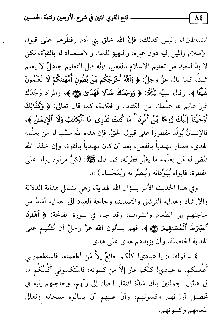 4 قوله: "يا عبادي! كلُّكم جائعٌ إلاَّ مَن أطعمته، فاستطعموني أُطْعمكم، يا عبادي! كلُّكم عار إلاَّ مَن كَسوته، فاسْتكسوني أَكْسُكُم"، في هاتَين الجملتين بيان شدَّة افتقار العباد إلى ربِّهم، وحاجتهم إليه في تحصيل أرزاقهم وكسوتهم، وأنَّ عليهم أن يسألوه سبحانه وتعالى طعامهم وكسوتهم.