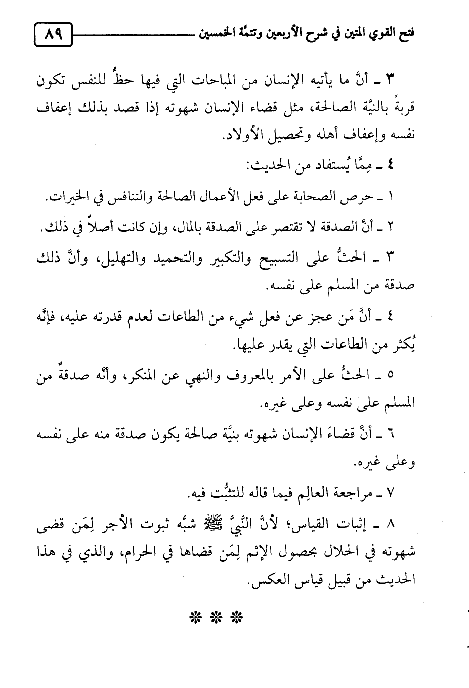3 أنَّ ما يأتيه الإنسان من المباحات التي فيها حظُّ للنفس تكون قربةً بالنيَّة الصالحة، مثل قضاء الإنسان شهوته إذا قصد بذلك إعفاف نفسه وإعفاف أهله وتحصيل الأولاد.