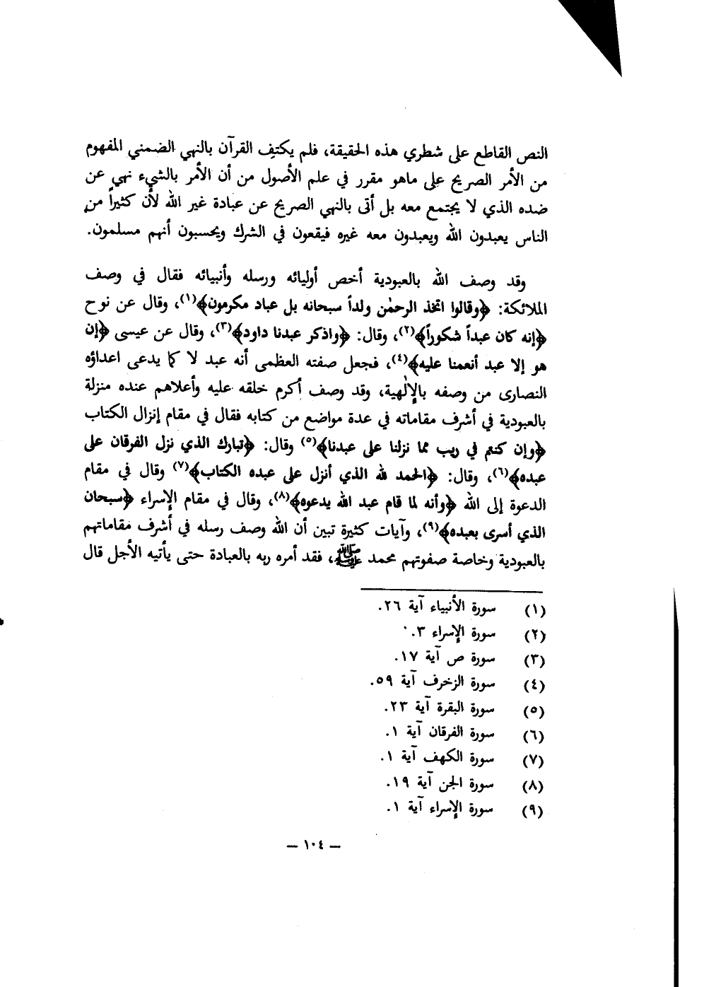 وقد وصف الله بالعبودية أخص أوليائه ورسله وأنبيائه فقال في وصف الملائكة: {وَقَالُوا اتَّخَذَ الرَّحْمَنُ وَلَداً سُبْحَانَهُ بَلْ عِبَادٌ مُكْرَمُونَ} 1، وقال عن نوح: {إِنَّهُ كَانَ عَبْداً شَكُورا} 2، وقال: {وَاذْكُرْ عَبْدَنَا دَاوُدَ} 3، وقال عن عيسى: {إِنْ هُوَ إِلاَّ عَبْدٌ أَنْعَمْنَا عَلَيْه} 4، فجعل صفته العظمى أنه عبد لا كما يدعي أعداؤه النصارى من وصفه بالإلهية، وقد وصف أكرم خلقه عليه وأعلاهم عنده منزلة بالعبودية في أشرف مقاماته في عدة مواضع من كتابه, فقال في مقام إنزال الكتاب: {وَإِنْ كُنتُمْ فِي رَيْبٍ مِمَّا نَزَّلْنَا عَلَى عَبْدِنَا} 5 وقال: {تَبَارَكَ الَّذِي نَزَّلَ الْفُرْقَانَ عَلَى عَبْدِهِ} 6، وقال: {الْحَمْدُ لِلَّهِ الَّذِي أَنزَلَ عَلَى عَبْدِهِ الْكِتَاب} 7، وقال في مقام الدعوة إلى الله: {وَأَنَّهُ لَمَّا قَامَ عَبْدُ اللَّهِ يَدْعُوه} 8، وقال في مقام الإسراء: {سُبْحَانَ الَّذِي أَسْرَى بِعَبْدِه} 9، وآيات كثيرة تبين أن الله وصف رسله في أشرف مقاماتهم بالعبودية وخاصة صفوتهم محمد صلى الله عليه وسلم، فقد أمره ربه بالعبادة حتى يأتيه الأجل, قال