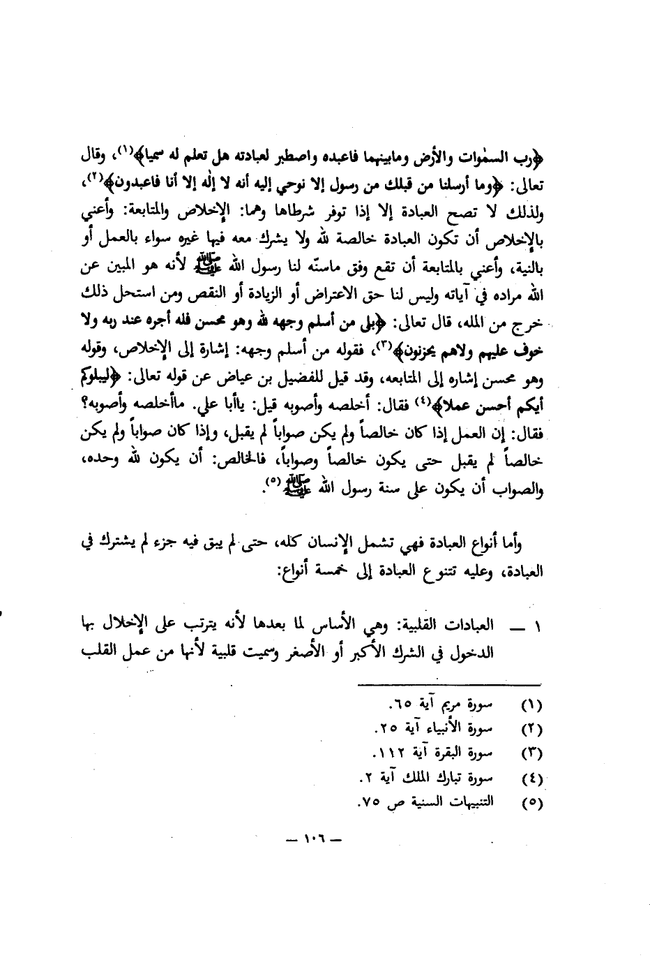{رَبُّ السَّمَوَاتِ وَالأَرْضِ وَمَا بَيْنَهُمَا فَاعْبُدْهُ وَاصْطَبِرْ لِعِبَادَتِهِ هَلْ تَعْلَمُ لَهُ سَمِيّاً} 1، وقال تعالى: {وَمَا أَرْسَلْنَا مِنْ قَبْلِكَ مِنْ رَسُولٍ إِلاَّ نُوحِي إِلَيْهِ أَنَّهُ لا إِلَهَ إِلاَّ أَنَا فَاعْبُدُونِ} 2، ولذلك لا تصح العبادة إلا إذا توفر شرطاها وهما: الإخلاص والمتابعة, وأعني بالإخلاص: أن تكون العبادة خالصة لله ولا شريك معه فيها غيره سواء بالعمل أو بالنية، وأعني بالمتابعة: أن تقع وفق ما سنه لنا رسول الله صلى الله عليه وسلم؛ لأنه هو المبين عن الله مراده في آياته, وليس لنا حق الاعتراض أو الزيادة أو النقص, ومن استحل ذلك خرج من الملة، قال تعالى: {بَلَى مَنْ أَسْلَمَ وَجْهَهُ لِلَّهِ وَهُوَ مُحْسِنٌ فَلَهُ أَجْرُهُ عِنْدَ رَبِّهِ وَلا خَوْفٌ عَلَيْهِمْ وَلا هُمْ يَحْزَنُون} 3، فقوله: مَنْ أَسْلَمَ وَجْهَهُ} ، إشارة إلى الإخلاص، وقوله {وَهُوَ مُحْسِنٌ} إشارة إلى المتابعة، وقد قيل للفضيل بن عياض عن قوله تعالى: {لِيَبْلُوَكُمْ أَيُّكُمْ أَحْسَنُ عَمَلاً} 4 فقال: أخلصه وأصوبه قيل: يا أبا علي, ما أخلصه وأصوبه؟ فقال: إن العمل إذا كان خالصًا ولم يكن صوابًا لم يقبل، وإذا كان صوابًا ولم يكن خالصًا لم يقبل, حتى يكون خالصًا وصوابًا، فالخالص: أن يكون لله وحده، والصواب: أن يكون على سنة رسول الله صلى الله عليه وسلم5.