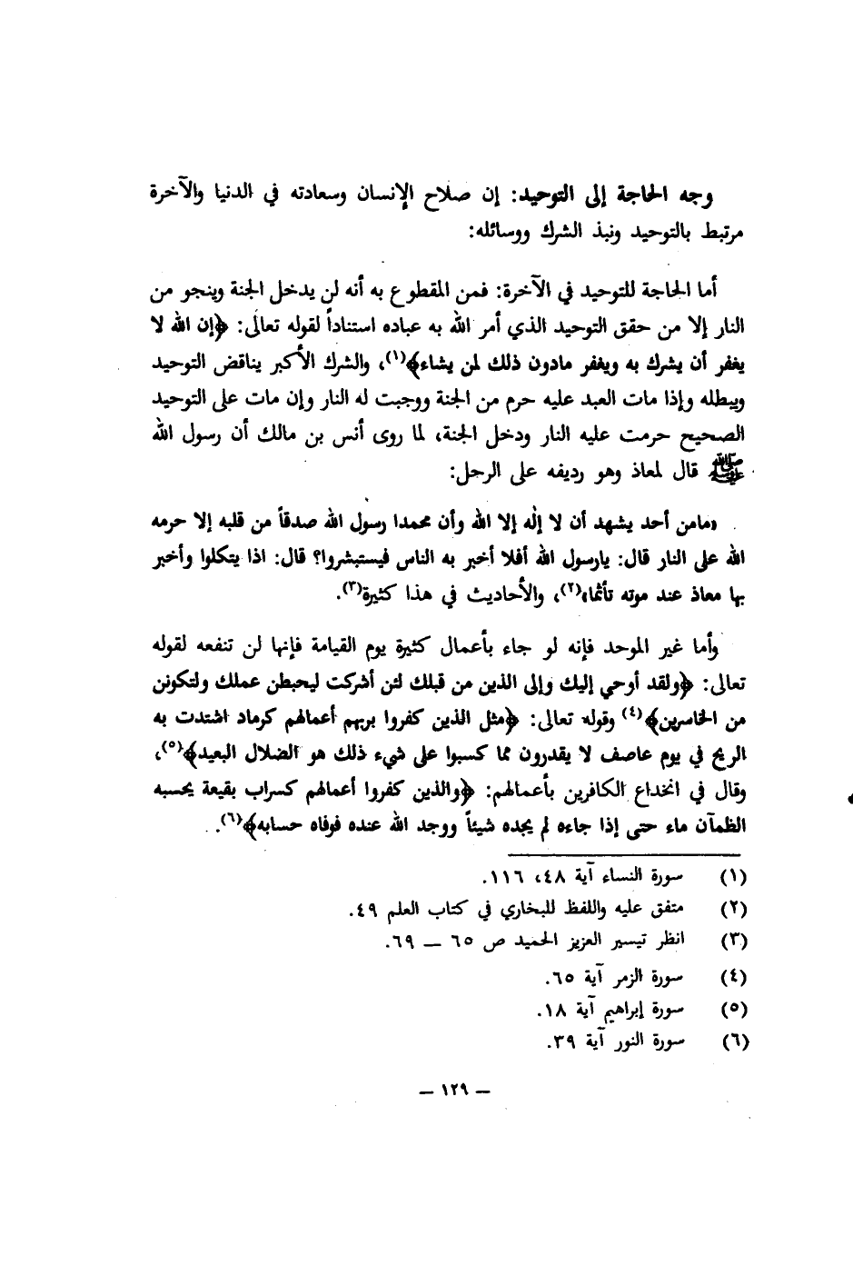 وجه الحاجة إلى التوحيد: إن صلاح الإنسان وسعادته في الدنيا والآخرة مرتبط بالتوحيد ونبذ الشرك ووسائله: