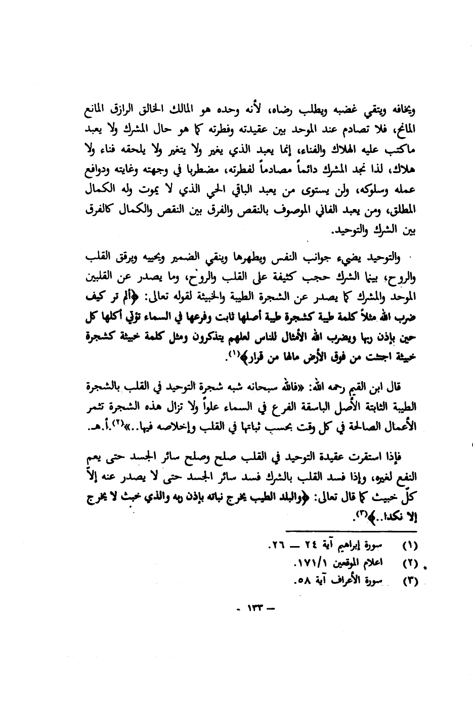قال ابن القيم رحمه الله: "فالله سبحانه شبَّه شجرة التوحيد في القلب بالشجرة الطيبة الثابتة الأصل الباسقة الفرع في السماء علوًا, ولا تزال هذه الشجرة تثمر الأعمال الصالحة في كل وقت بحسب ثباتها في القلب وإخلاصه فيها.."2 ا. هـ.