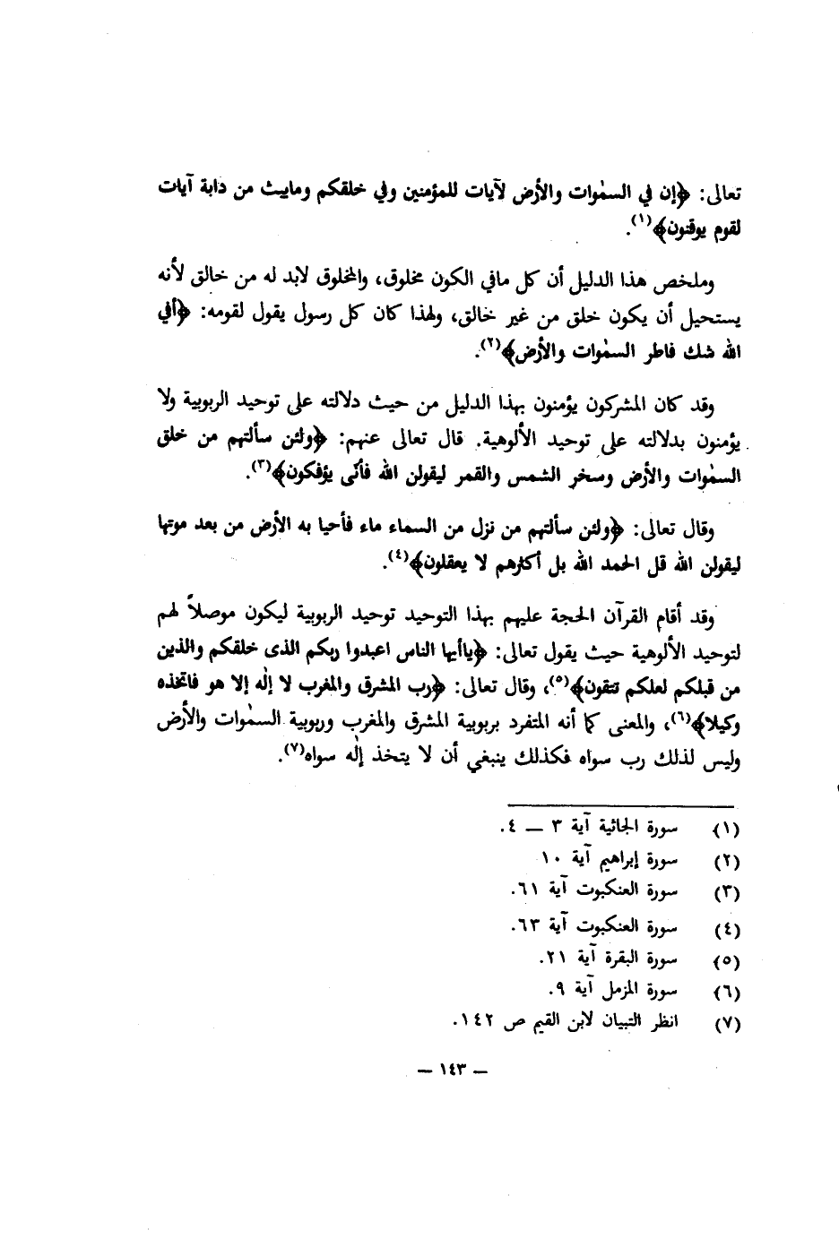وقد أقام القرآن الحجة عليه بهذا التوحيد توحيد الربوبية ليكون موصلًا لهم لتوحيد الألوهية, حيث يقول تعالى: {يَا أَيُّهَا النَّاسُ اعْبُدُوا رَبَّكُمُ الَّذِي خَلَقَكُمْ وَالَّذِينَ مِنْ قَبْلِكُمْ لَعَلَّكُمْ تَتَّقُونَ} 5، وقال تعالى: {رَبُّ الْمَشْرِقِ وَالْمَغْرِبِ لا إِلَهَ إِلاَّ هُوَ فَاتَّخِذْهُ وَكِيلاً} 6، والمعنى: كما أنه المتفرد بربوبية المشرق والمغرب وربوبية السموات والأرض وليس لذلك رب سواه, فكذلك ينبغي أن لا يُتخذ إلهٌ سواه7.