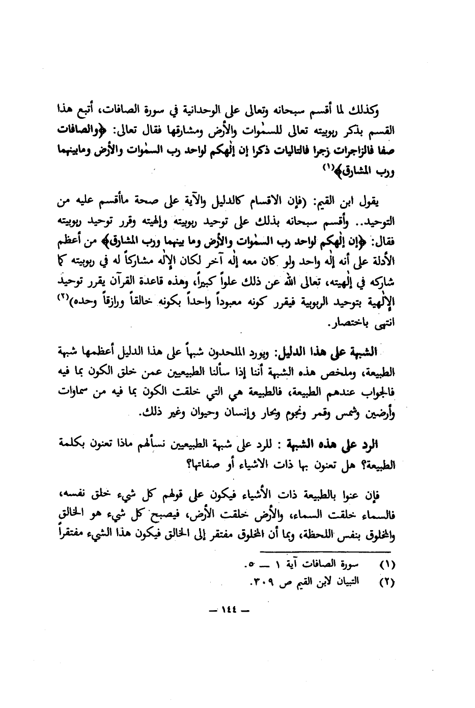 يقول ابن القيم: فإن الإقسام كالدليل والآية على صحة ما أقسم عليه من التوحيد.. وأقسم سبحانه بذلك على توحيد ربوبيته وإلهيته وقرر توحيد ربوبيته فقال: {إِنَّ إِلَهَكُمْ لَوَاحِدٌ, رَبُّ السَّمَوَاتِ وَالأَرْضِ وَمَا بَيْنَهُمَا وَرَبُّ الْمَشَارِقِ} من أعظم الأدلة على أنه إله واحد ولو كان معه إله آخر لكان الإله مشاركًا له في ربوبيته كما شاركه في إلهيته، تعالى الله عن ذلك علوًا كبيرًا، وهذه قاعدة القرآن يقرر توحيد الإلهية بتوحيد الربوبية, فيقرر كونه معبودًا واحدًا بكونه خالقًا ورازقًا وحده"2 انتهى باختصار.