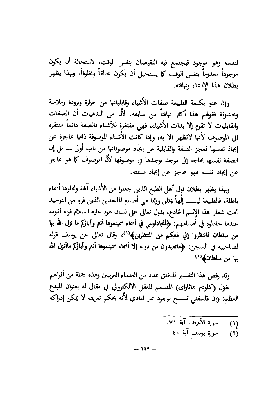 وإن عنوا بكلمة الطبيعة صفات الأشياء وقابلياتها من حرارة وبرودة وملاسة وخشونة, فقولهم هذا أكثر تهافتًا من سابقه؛ لأن من البدهيات أن الصفات والقابليات لا تقوم إلا بذات الأشياء، فهي مفتقرة للأشياء, فالصفة دائمًا مفتقرة إلى الموصوف لأنها لا تظهر إلا به، وإذا كانت الأشياء الموصوفة ذاتها عاجزة عن إيجاد نفسها فعجز الصفة والقابلية عن إيجاد موصوفاتها من باب أولى -بل إن الصفة نفسها بحاجة إلى موجد يوجدها في موصوفها؛ لأن الموصف كما هو عاجز عن إيجاد نفسه فهو عاجز عن إيجاد صفته.