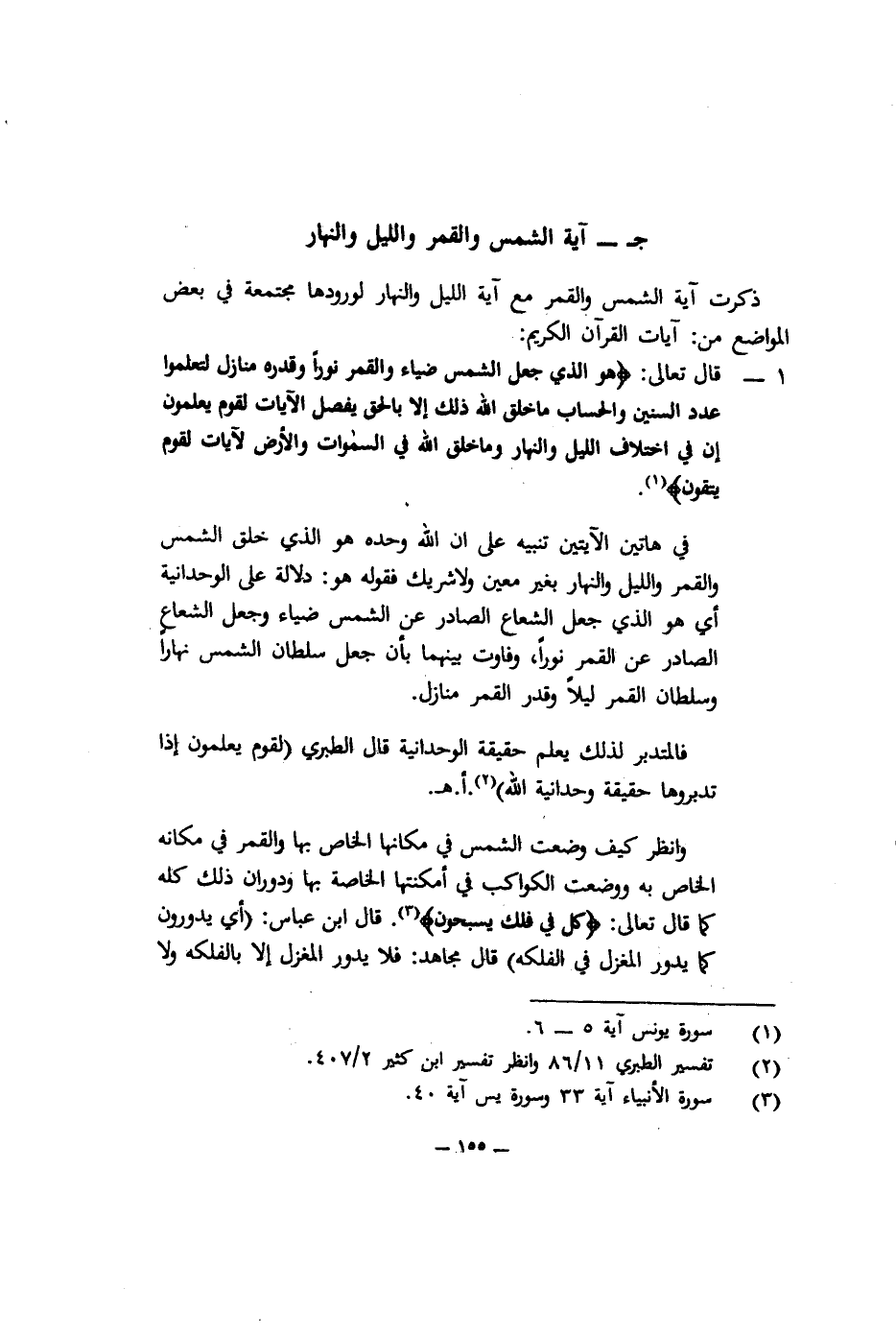 1- قال تعالى: {هُوَ الَّذِي جَعَلَ الشَّمْسَ ضِيَاءً وَالْقَمَرَ نُوراً وَقَدَّرَهُ مَنَازِلَ لِتَعْلَمُوا عَدَدَ السِّنِينَ وَالْحِسَابَ مَا خَلَقَ اللَّهُ ذَلِكَ إِلاَّ بِالْحَقِّ يُفَصِّلُ الآيَاتِ لِقَوْمٍ يَعْلَمُونَ, إِنَّ فِي اخْتِلافِ اللَّيْلِ وَالنَّهَارِ وَمَا خَلَقَ اللَّهُ فِي السَّمَوَاتِ وَالأَرْضِ لآيَاتٍ لِقَوْمٍ يَتَّقُونَ} 1.