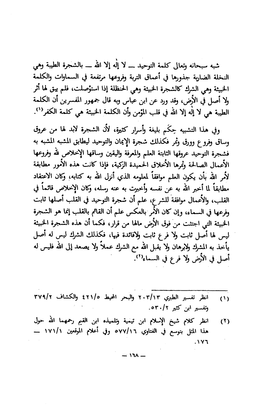 وفي هذا التشبيه حِكَم بليغة وأسرار كثيرة؛ لأن الشجرة لا بد لها من عروق وساق وفروع وورق وثمر فكذلك شجرة الإيمان والتوحيد, ليطابق المشبه المشبه به, فشجرة التوحيد عروقها الثابتة: العلم والمعرفة واليقين, وساقها: الإخلاص لله, وفروعها: الأعمال الصالحة, وثمرها: الأخلاق الحميدة الزكية، فإذا كانت هذه الأمور مطابقة لأمر الله بأن يكون العلم موافقًا لمعلومه الذي أنزل الله به كتابه، وكان الاعتقاد مطابقًا لما أخبر الله به عن نفسه وأخبرت به عنه رسله، وكان الإخلاص قائمًا في القلب، والأعمال موافقة للشرع، علم أن شجرة التوحيد في القلب أصلها ثابت وفرعها في السماء، وإن كان الأمر بالعكس علم أن القائم بالقلب إنما هو الشجرة الخبيثة التي اجتثت من فوق الأرض ما لها من قرار، فكما أن هذه الشجرة الخبيثة ليس لها أصل ثابت ولا فرع ثابت ولا فائدة فيها، فكذلك الشرك ليس له أصل يأخذ به المشرك ولا برهان ولا يقبل الله مع الشرك عملًا ولا يصعد إلى الله فليس له أصل في الأرض ولا فرع في السماء2.
