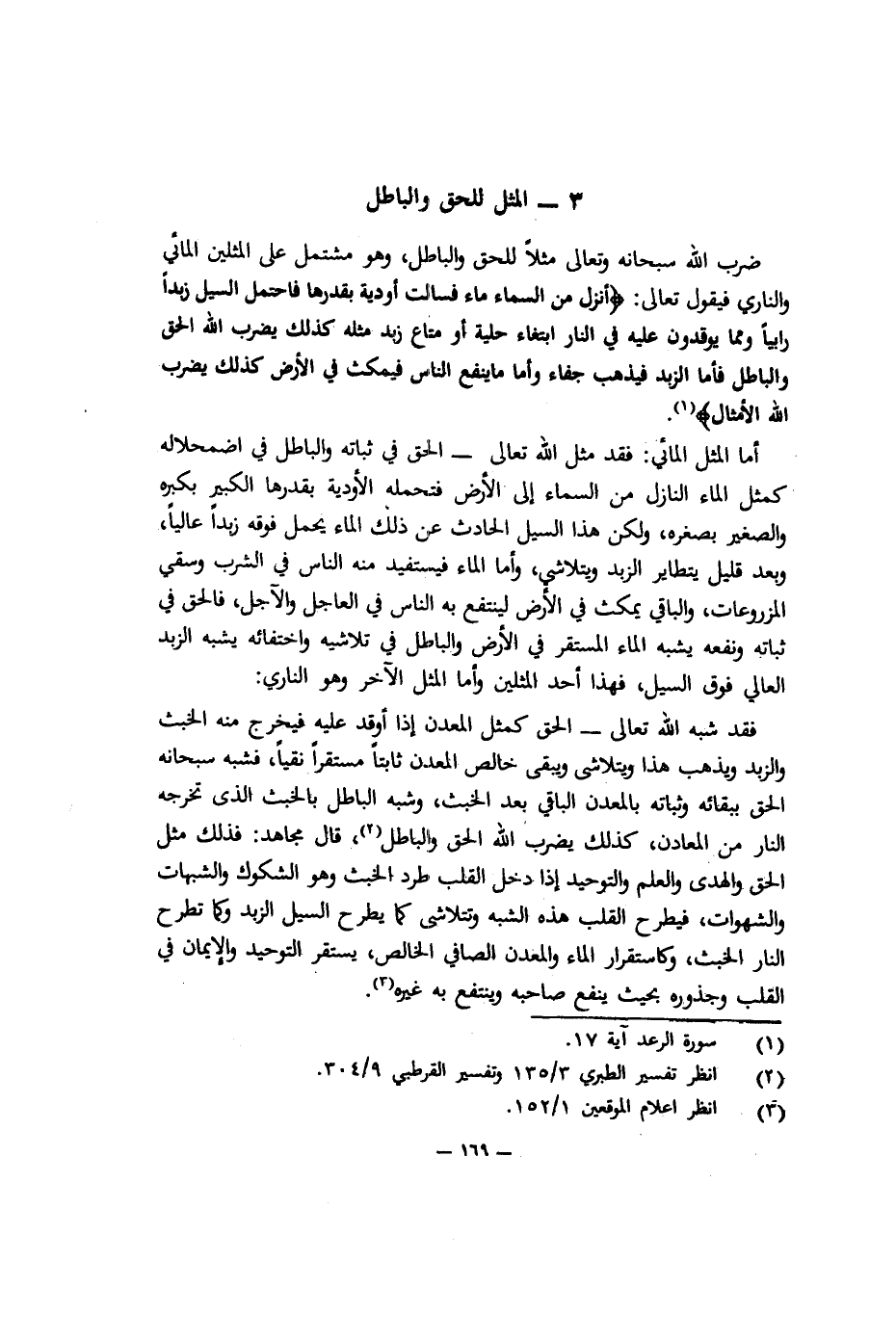 وأما المثل الآخر وهو الناري: فقد شبه الله تعالى الحق كمثل المعدن إذا أوقد عليه فيخرج منه الخبث والزبد ويذهب هذا ويتلاشى ويبقى خالص المعدن ثابتًا مستقرًّا نقيًّا، فشبه سبحانه الحق ببقائه وثباته بالمعدن الباقي بعد الخبث، وشبه الباطل بالخبث الذي تخرجه النار من المعادن، كذلك يضرب الله الحق والباطل2، قال مجاهد: فذلك مثل الحق والهدى والعلم والتوحيد إذا دخل القلب طرد الخبث وهو الشكوك والشبهات والشهوات، فيطرح القلب هذه الشبه وتتلاشى كما يطرح السيل الزبد وكما تطرح النار الخبث، وكاستقرار الماء والمعدن الصافي الخالص، يستقر التوحيد والإيمان في القلب وجذوره بحيث ينفع صاحبه وينتفع به غيره3.