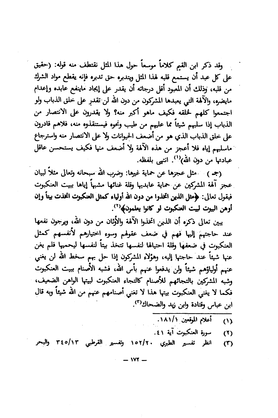 وقد ذكر ابن القيم كلامًا موسعًا حول هذا المثل نقتطف منه قوله: "حقيق على كل عبد أن يستمع قلبه لهذا المثل ويتدبره حق تدبره؛ فإنه يقطع مواد الشرك من قلبه، وذلك أن المعبود أقل درجاته أن يقدر على إيجاد ما ينفع عابده وإعدام ما يضره، والآلهة التي يعبدها المشركون من دون الله لن تقدر على خلق الذباب ولو اجتمعوا كلهم لخلقه، فكيف ما هو أكبر منه؟ ولا يقدرون على الانتصار من الذباب إذا سلبهم شيئًا مما عليهم من طيب ونحوه فيستنقذوه منه، فلا هم قادرون على خلق الذباب الذي هو من أضعف الحيوانات ولا على الانتصار منه واسترجاع ما سلبهم إياه, فلا أعجز من هذه الآلهة ولا أضعف منها, فكيف يستحسن عاقلٌ عبادتها من دون الله"1 انتهى بلفظه.