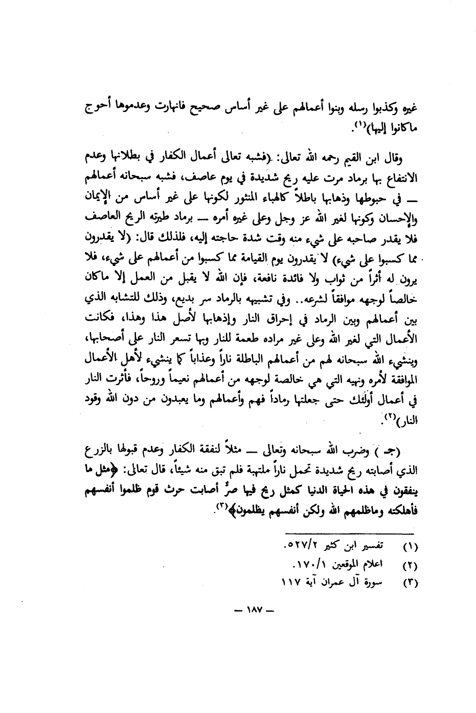 وقال ابن القيم رحمه الله تعالى: "فشبه تعالى أعمال الكفار في بطلانها وعدم الانتفاع بها برماد مرت عليه ريح شديدة في يوم عاصف، فشبه سبحانه أعمالهم -في حبوطها وذهابها باطلًا كالهباء المنثور لكونها على غير أساس من الإيمان والإحسان وكونها لغير الله عز وجل وعلى غير أمره- برماد طيرته الريح العاصف فلا يقدر صاحبه على شيء منه وقت شدة حاجته إليه، فلذلك قال: {لا يَقْدِرُونَ مِمَّا كَسَبُوا عَلَى شَيْء} لا يقدرون يوم القيامة مما كسبوا من أعمالهم على شيء، فلا يرون له أثرًا من ثواب ولا فائدة نافعة، فإن الله لا يقبل من العمل إلا ما كان خالصًا لوجهه موافقًا لشرعه.. وفي تشبيهه بالرماد سر بديع، وذلك للتشابه الذي بين أعمالهم وبين الرماد في إحراق النار وإذهابها لأصل هذا وهذا، فكانت الأعمال التي لغير الله وعلى غير مراده طعمة للنار وبها تسعر النار على أصحابها، وينشئ الله سبحانه لهم من أعمالهم الباطلة نارًا وعذابًا كما ينشئ لأهل الأعمال الموافقة لأمره ونهيه -التي هي خالصة لوجهه من أعمالهم- نعيمًا وروحًا، فأثرت النار في أعمال أولئك حتى جعلتها رمادًا, فهم وأعمالهم وما يعبدون من دون الله وقود النار"2.