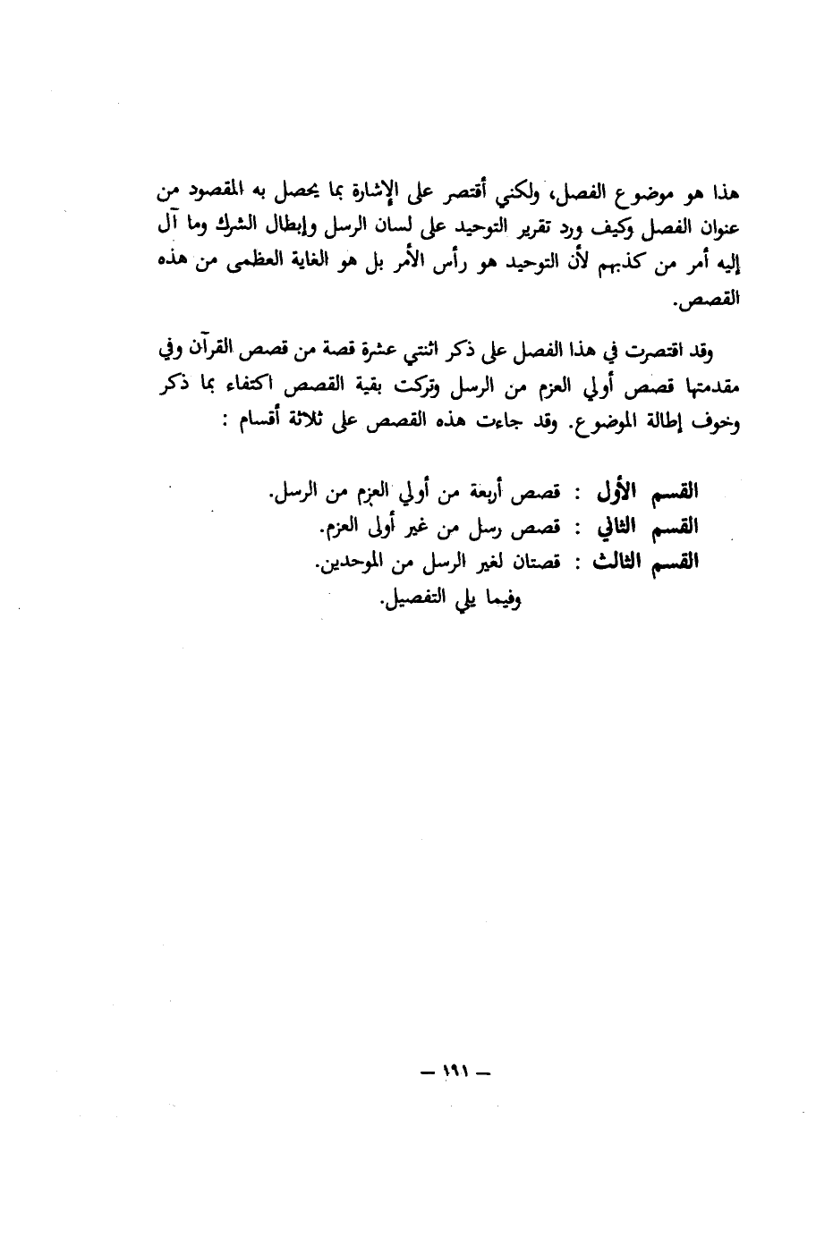 وقد اقتصرت في هذا الفصل على ذكر اثنتي عشرة قصة من قصص القرآن وفي مقدمتها قصص أولي العزم من الرسل وتركت بقية القصص اكتفاءً بما ذكر وخوف إطالة الموضوع. وقد جاءت هذه القصص على ثلاثة أقسام: