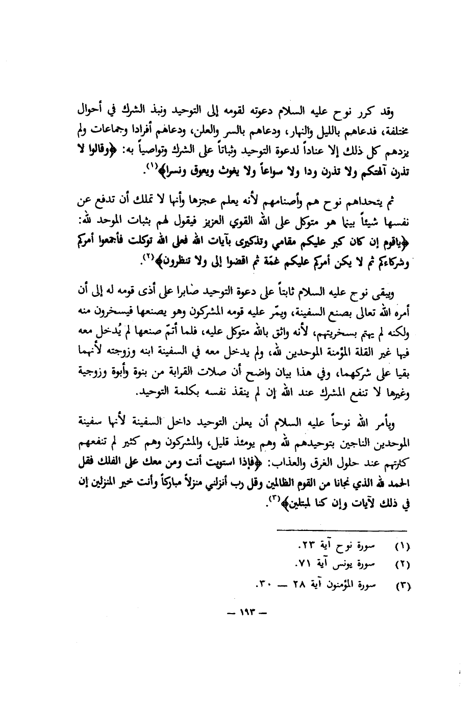 ويبقى نوح عليه السلام ثابتًا على دعوة التوحيد صابرًا على أذى قومه له إلى أن أمره الله تعالى بصنع السفينة، ويمر عليه قومه المشركون وهو يصنعها فيسخرون منه فيها، غير القلة المؤمنة الموحدين لله، ولم يدخل معه في السفينة ابنه وزوجته لأنهما بقيا على شركهما، وفي هذا بيان واضح أن صلات القرابة من بنوة وأبوة وزوجية وغيرها لا تنفع المشرك عند الله إن لم ينقذ نفسه بكلمة التوحيد.
